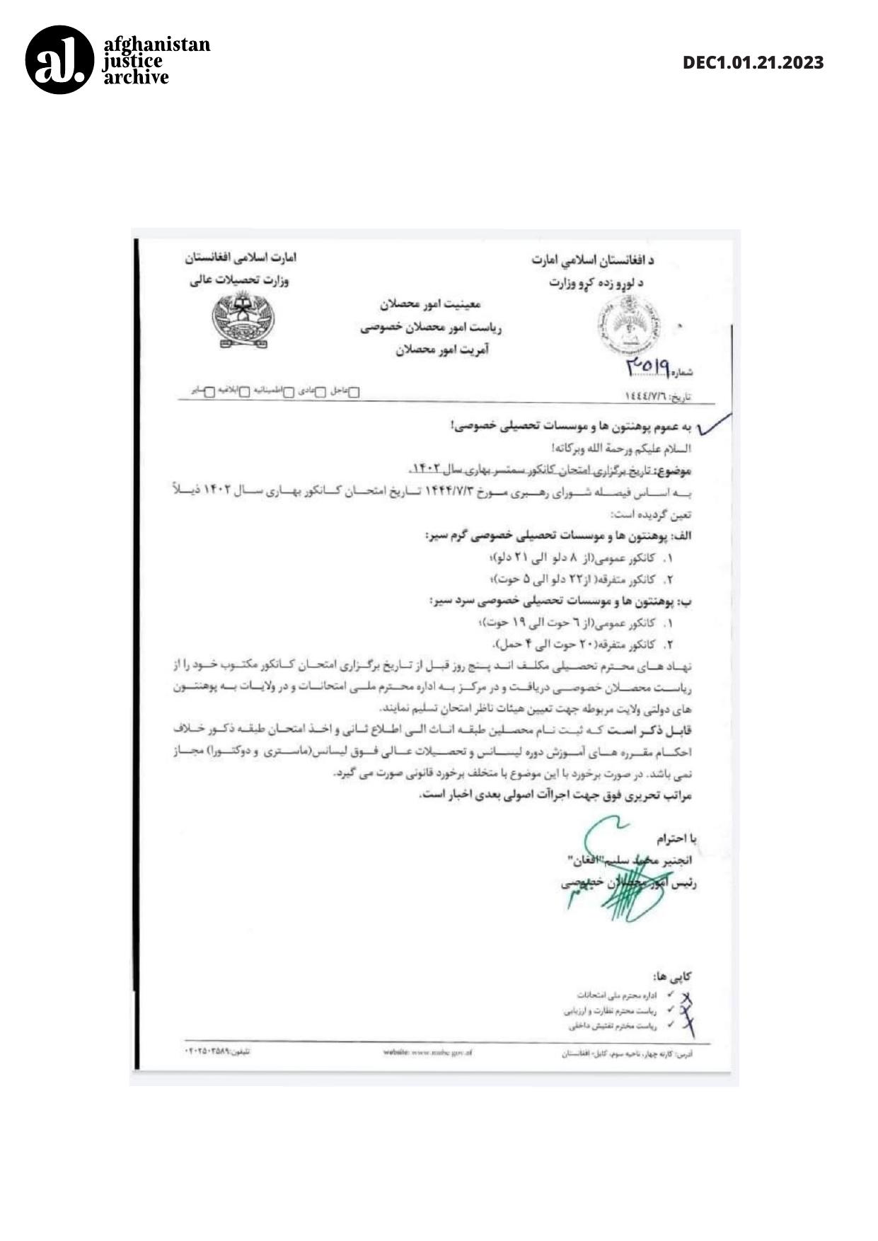 Every year, Afghan students take a national exam called the KANKOR which is a university entrance exam. This official directive announces the date of the exam while explicitly prohibiting girls from taking this exam.