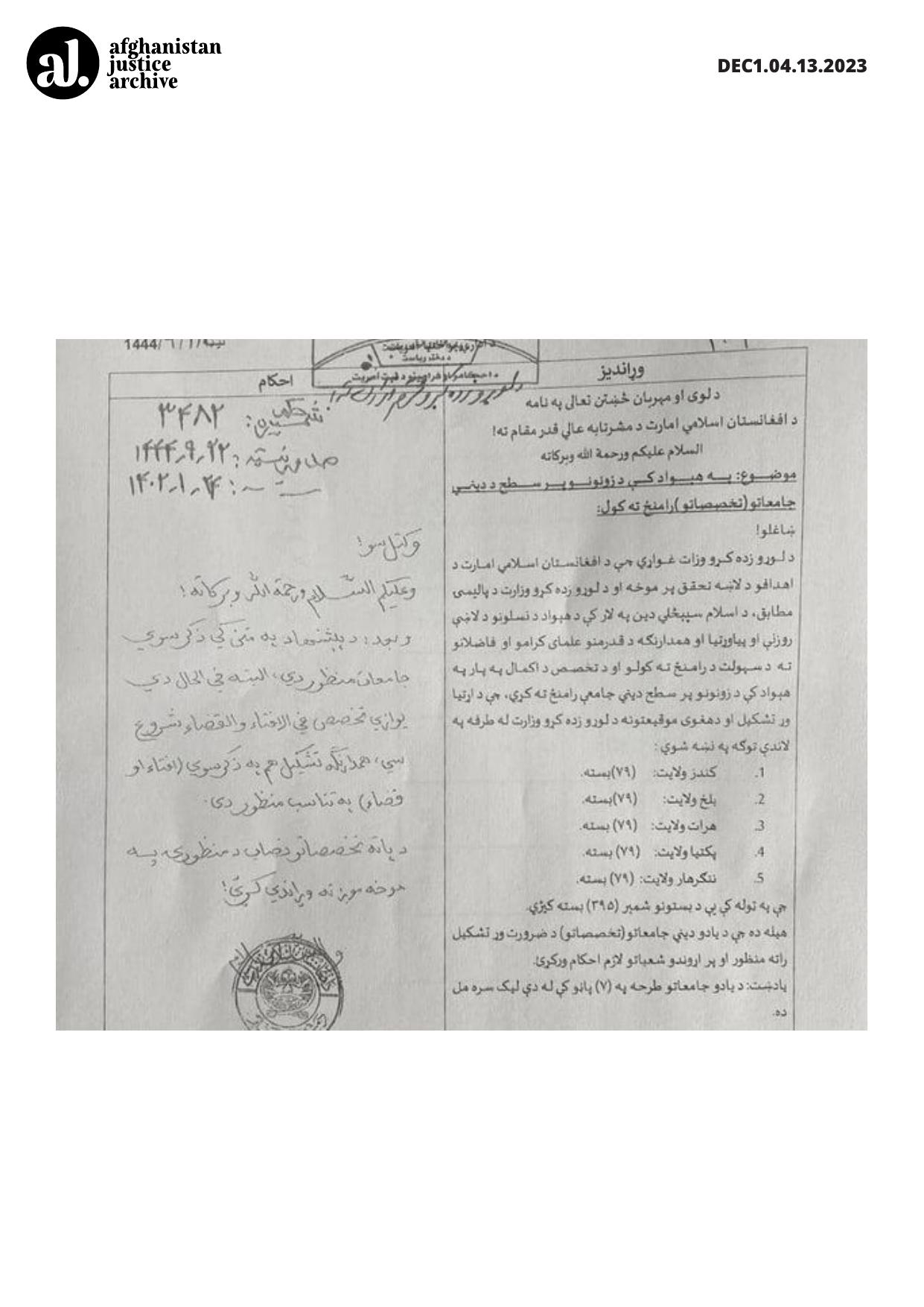 This official letter by the Ministry of Higher Education proposing to establish religious institutions in key provinces signals a deliberate expansion of the Taliban's ideological apparatus under the guise of moral education. While framed as an initiative to "strengthen youth," the focus on exclusively religious specialization underscores a shift toward doctrinal conformity rather than balanced education. The request for nearly 400 positions reflects a substantial investment in institutionalizing religious orthodoxy as a central component of state governance and education policy.