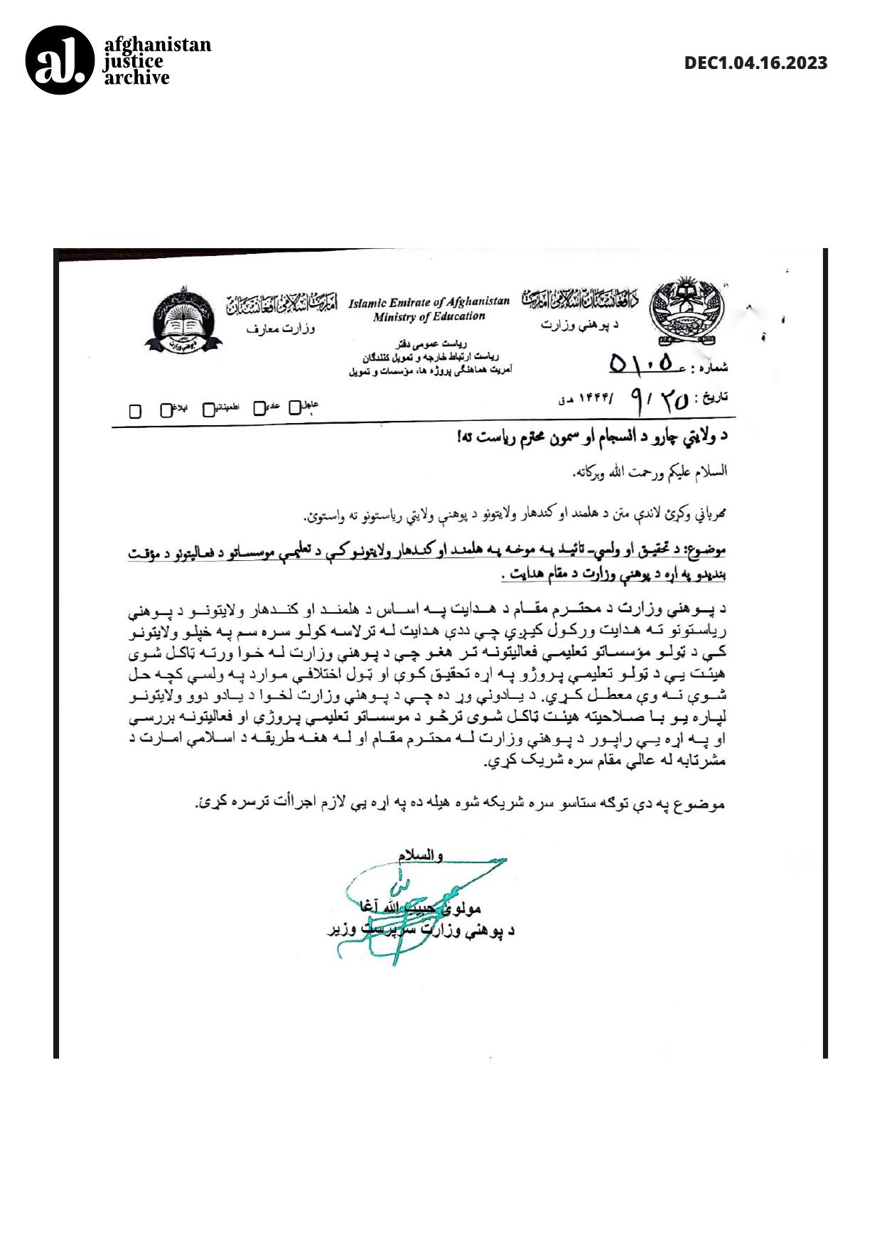 In accordance with the directive from the Ministry of Education, it is instructed that the Provincial Education Departments of Helmand and Kandahar immediately suspend all educational activities within their provinces. This suspension will remain in effect until the designated committee, appointed by the Ministry of Education, conducts an investigation into all educational projects and resolves any discrepancies at the public level.