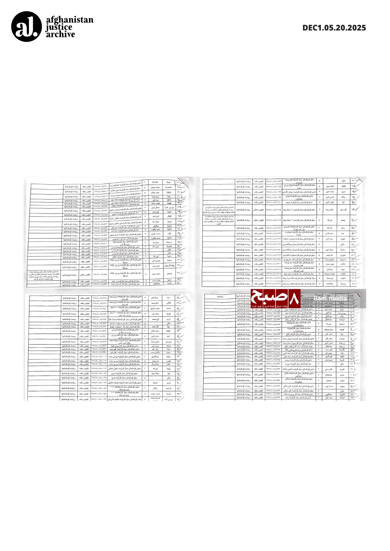 This document and accompanying reporting record the termination of female teachers and staff working in kindergartens across Kabul by the Taliban’s Ministry of Labor and Social Affairs. An internal administrative register lists 92 women whose employment was cancelled, without individualized reasons or reference to misconduct, following several months of unpaid salaries. The measure reflects the use of administrative action to remove women from early-childhood education roles and restrict their continued participation in paid public-sector work.