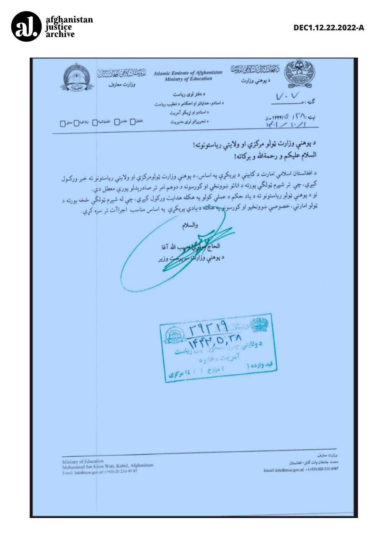 This official directive suspending education for girls beyond grade six across Afghanistan formalizes the Taliban’s nationwide ban on secondary and higher education for females. Issued by cabinet decision and signed by senior education authorities, it mandates compliance by all public and private educational institutions.