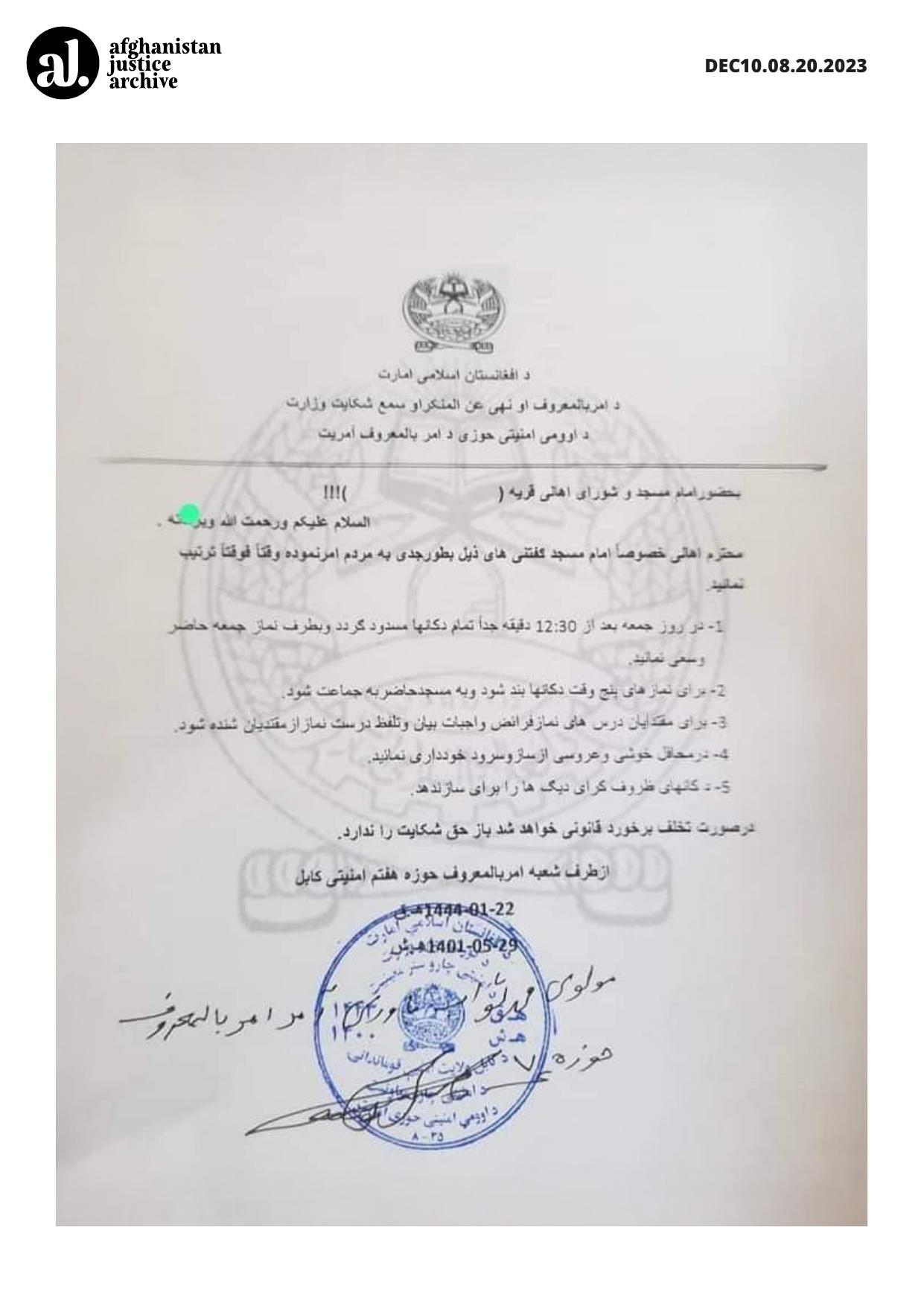 This directive illustrates the Taliban’s systematic enforcement of religious conformity and public morality through state authority and local community structures. By mandating mosque attendance, regulating business operations around prayer times, and banning music at both private events and commercial venues, the Taliban are using coercive religious policy to control daily life.