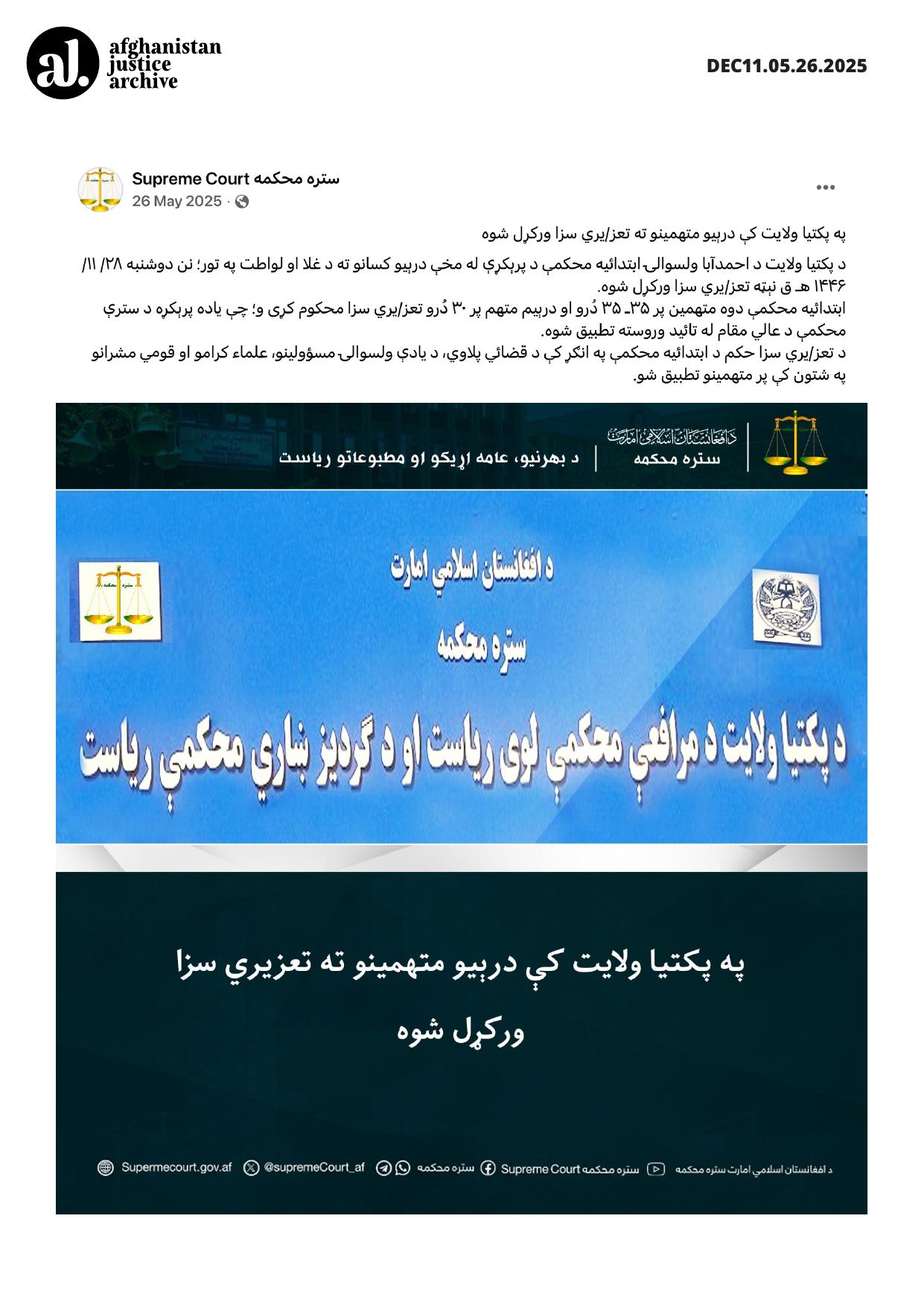 This entry documents the implementation of discretionary corporal punishment (taʿzir) in Ahmad Aba District of Paktia Province following a ruling by a Taliban primary court. Individuals accused of theft and sodomy were subjected to flogging after approval by the Supreme Court authority. The punishments were carried out in the court compound in the presence of judicial officials, local authorities, religious figures, and community representatives. The case reflects the continued use of corporal punishment within the Taliban justice system to enforce both criminal prohibitions and moral regulations concerning personal conduct.