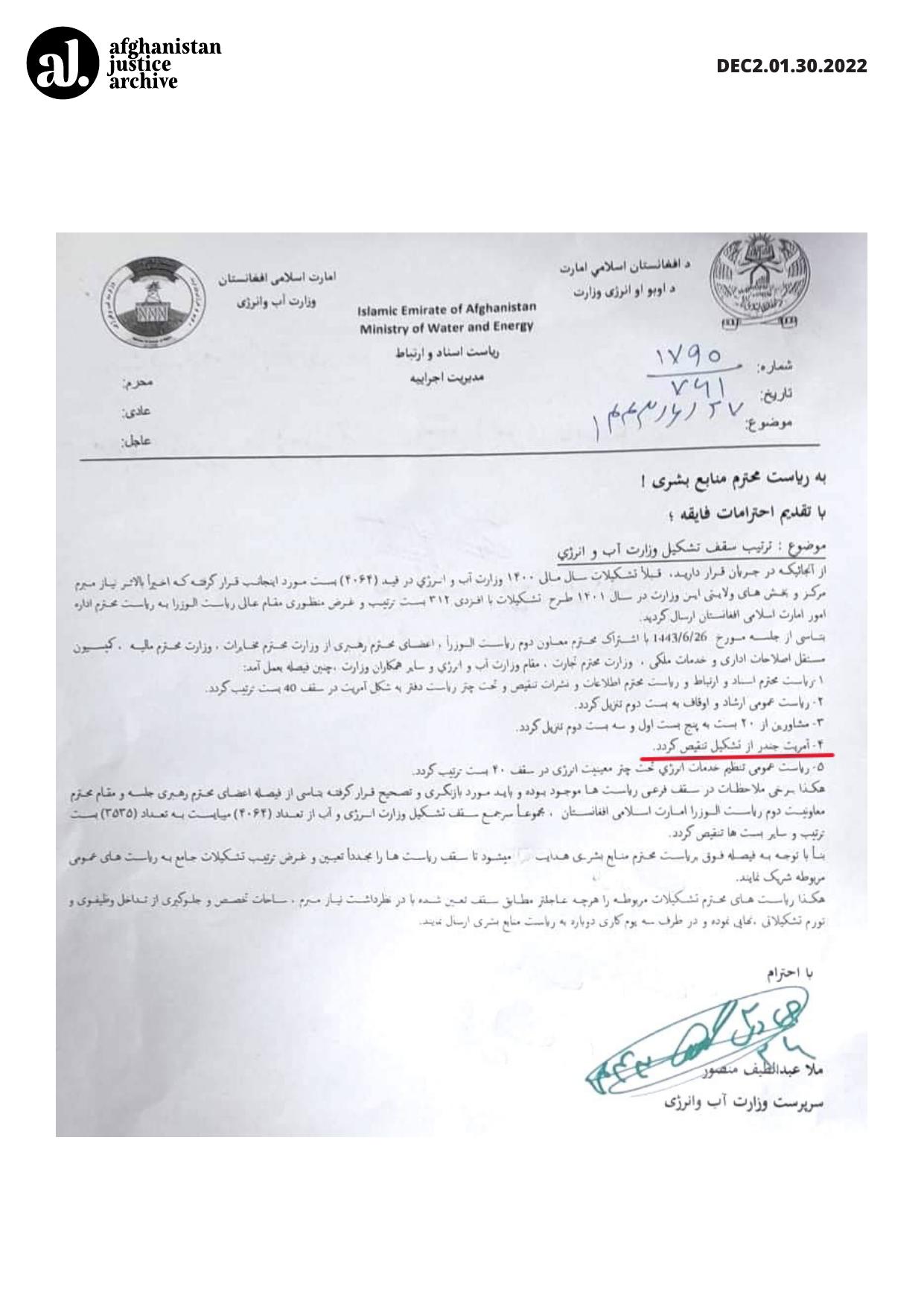 The official restructuring decision from the Taliban's Ministry of Energy and Water includes the elimination of the Gender Directorate, signaling an institutional rollback of efforts to support gender inclusion in government operations. While the restructuring appears administrative on the surface, the targeted removal of a department specifically focused on gender issues indicates a deliberate move to dismantle gender-responsive governance frameworks.