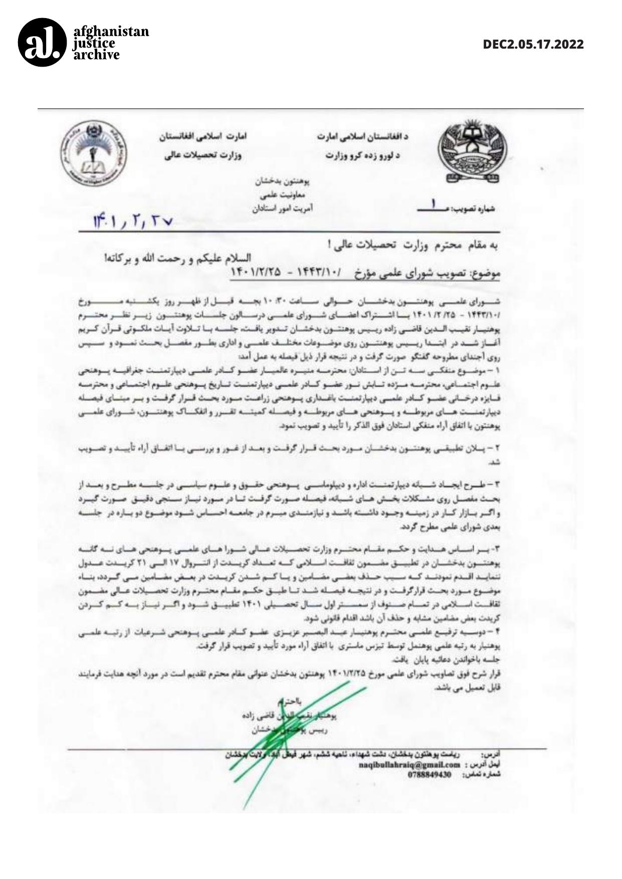 In this official letter from the Ministry of Higher Education in Badakhshan, the Taliban have agreed in a meeting to dismiss three female teachers from their positions in Badakhshan University without cause.