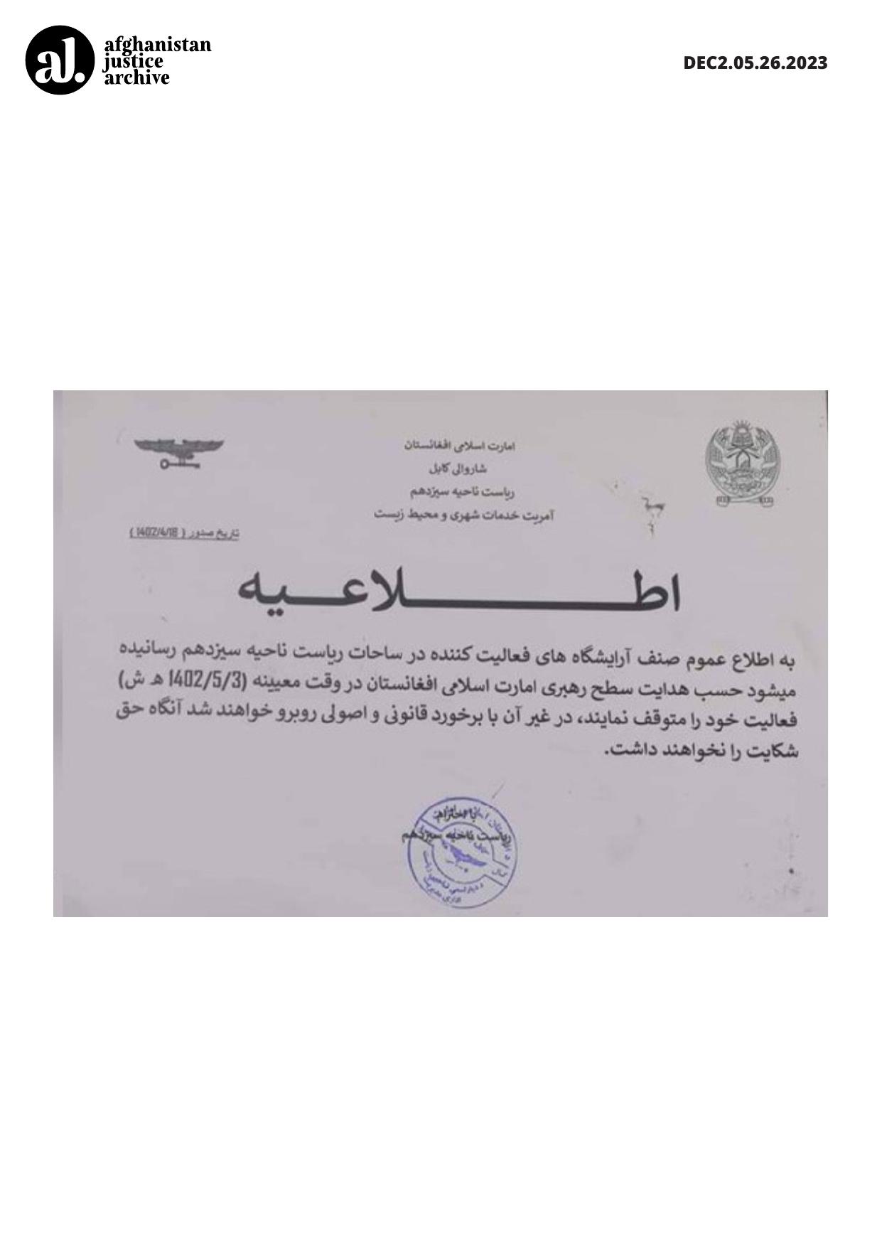 Announcement: "It is hereby informed to all beauty salons operating in the areas of District 17 that, in accordance with the directive from the leadership of the Islamic Emirate of Afghanistan, they must cease their activities by the designated time (1444/5/3 AH). Failure to comply will result in legal and formal action, and they will not have the right to file complaints thereafter."
