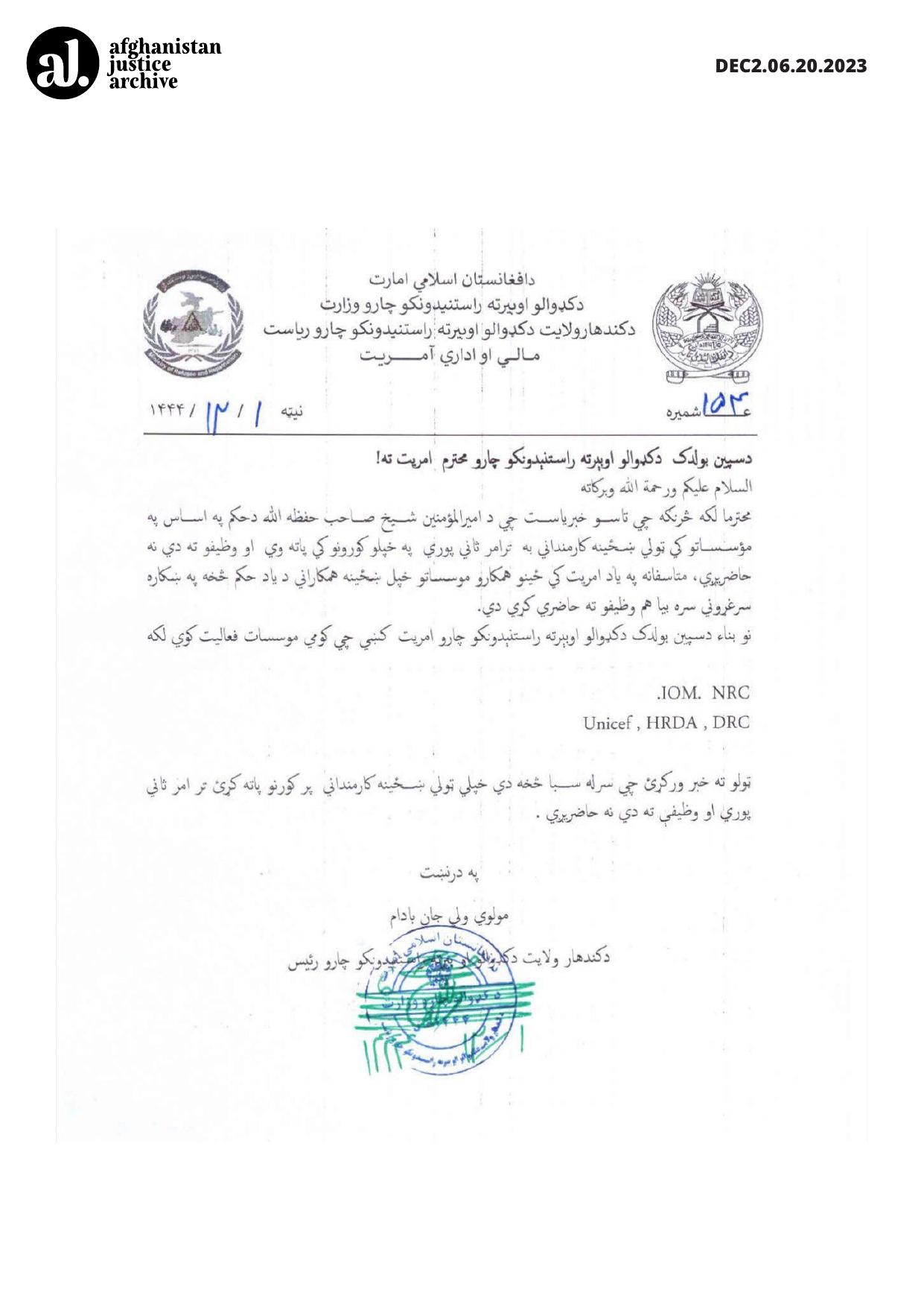 The Department of Refugees and Returnees has stated in an official letter: "As you are aware, based on the decree of the Amir al-Mu'minin, all female employees of non-governmental organizations must remain at home until further notice and refrain from reporting to work. It has been observed that some female employees of partner organizations have defied this order and are attending their duties. Therefore, please inform organizations working with the Spin Boldak Directorate, such as IOM, NRC, UNICEF, HRDA, and DRC, that starting tomorrow, all female employees in these organizations must stay at home and not report to work until further notice."