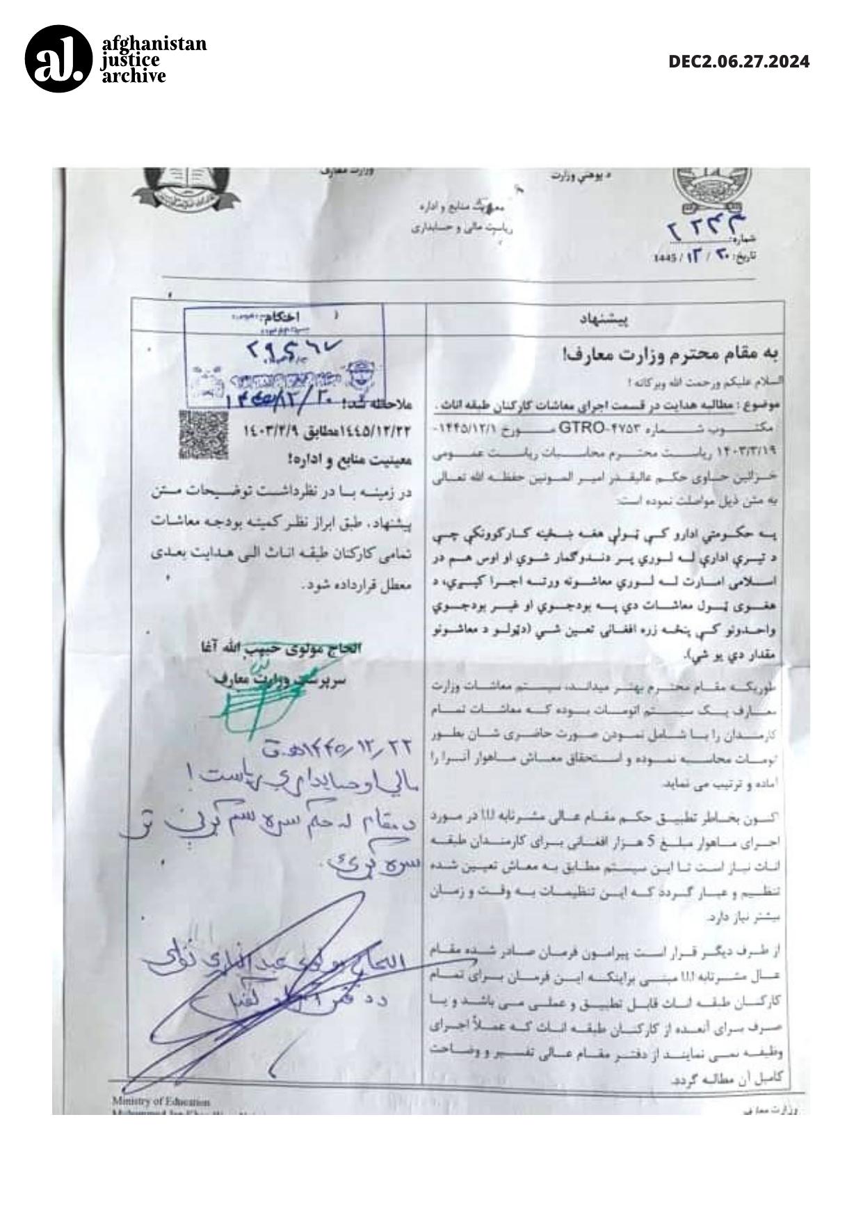 In order to implement the directive of the esteemed leadership of the Islamic Emirate regarding the payment of a 5,000 Afghani monthly salary for female employees, it is necessary to adjust and align this system with the newly determined salary amount. Such adjustments require additional time and resources.
