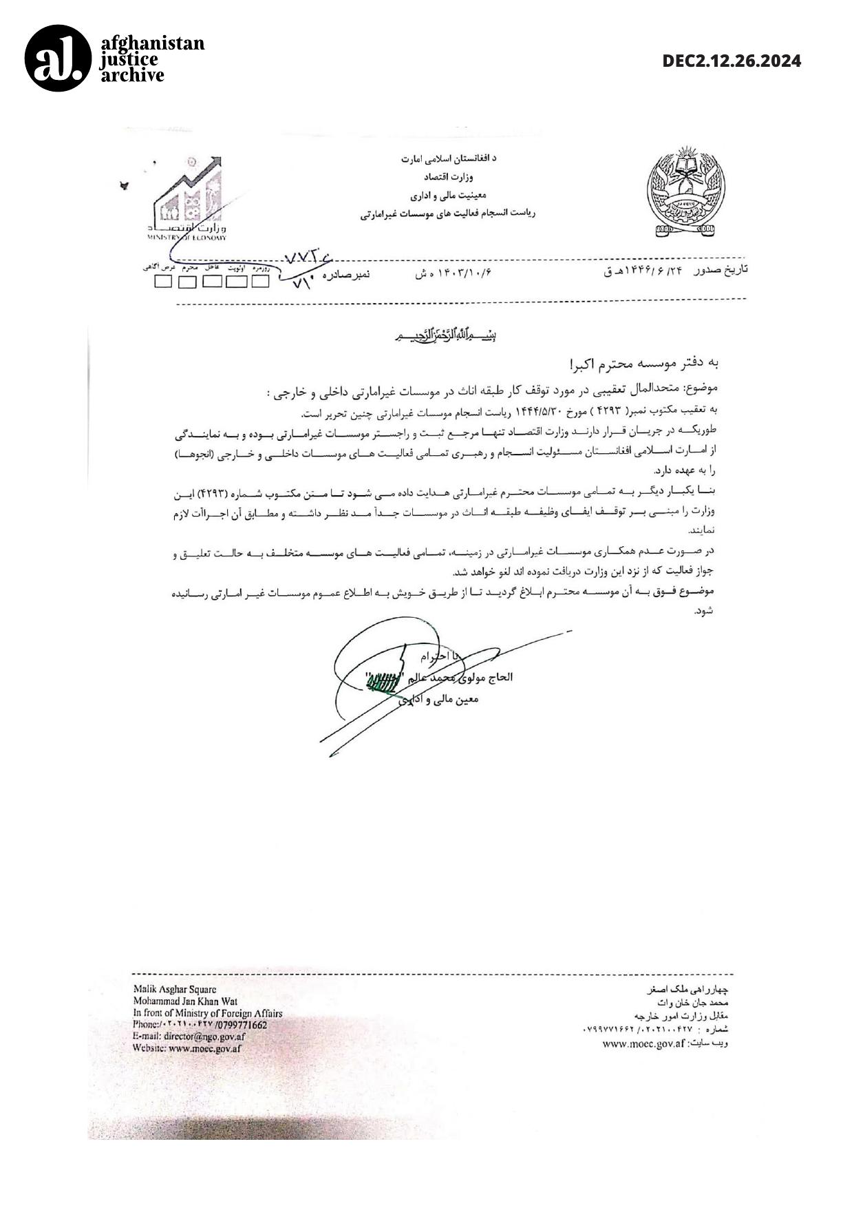 This directive issued by the Ministry of Economy, under the authority of the Taliban, mandates the suspension of female employment across all domestic and international NGOs and enforces compliance through threats of license revocation and operational shutdowns. The measure institutionalizes gender-based exclusion from the workforce and leverages economic coercion to compel organizational compliance. By embedding discrimination into regulatory control over civil society, the directive systematically undermines women’s livelihoods, autonomy, and participation in public and humanitarian life. A letter signed by Mohammad Alam, the Deputy Minister for Finance and Administration at the Ministry of Economy, emphasizes that the directive to halt the employment of women in non-governmental organizations must be strictly observed.