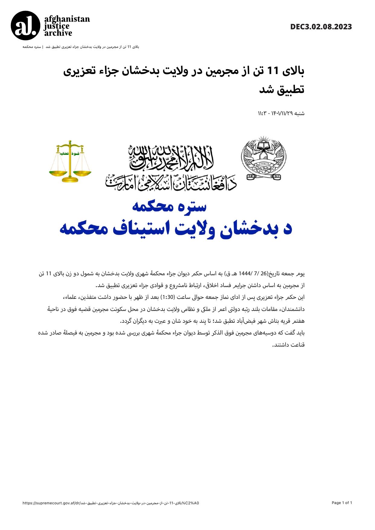 Date: 19/11/1401 The Supreme Court of the Taliban, through a press release on its official website, has announced that based on the decision of the Appeals Court of Ghor Province and the confirmation of the Taliban's Supreme Court, punishments by lashing have been administered to more than 3 individuals on charges of moral corruption and alcohol production. This verdict was executed publicly with the participation of Taliban leadership officials in the province.