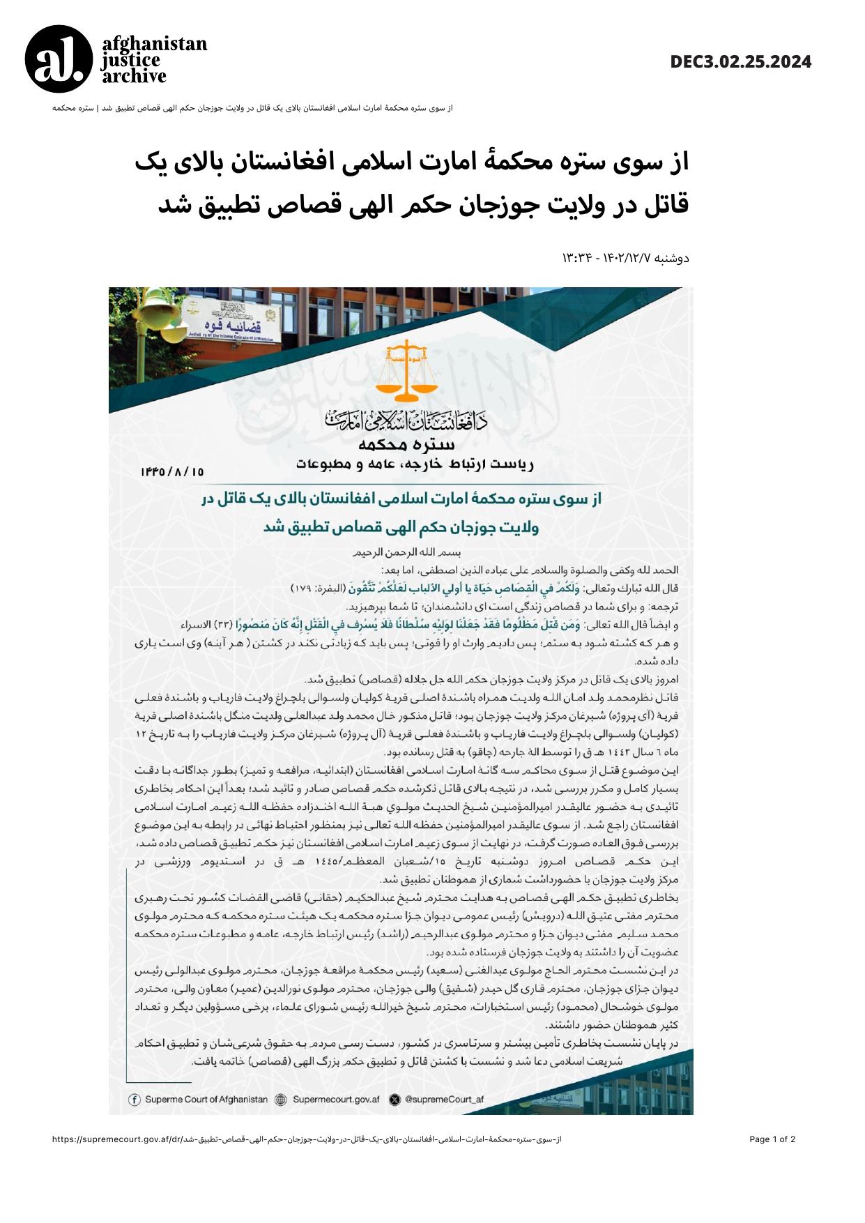 On 15 Sha'ban 1445 AH, the Taliban publicly carried out a Qisas (retribution) execution in Jowzjan province. The case, involving a murder committed with a knife, was reviewed and upheld by all three judicial levels and personally approved—twice—by Taliban leader Haibatullah Akhundzada. While the Taliban claim thorough legal review, the use of public executions under Qisas continues to raise serious concerns about due process, the right to a fair trial, and the use of capital punishment as public spectacle, in violation of international human rights standards.