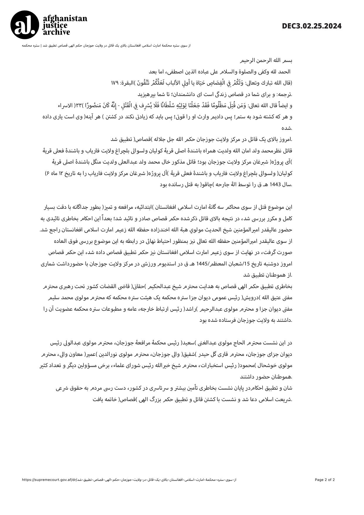 Date: 1445/08/15 Today, the verdict of Qisas (retribution) was carried out on a murderer in the center of Jowzjan province. The murderer, Nazar Mohammad, son of Amanullah, originally from the village of Kolyan, Belcheragh district, Faryab province, and currently residing in the village of (Ai Paroja), Sheberghan, the center of Jowzjan province, had killed Khal Mohammad, son of Abdul Ali, grandson of Mangal, originally from the village of Kolyan, Belcheragh district, Faryab province, and currently residing in the village of (Al Paroja), Sheberghan, Jowzjan province, on the 12th of 6th month, 1443 AH, using a sharp instrument (knife).