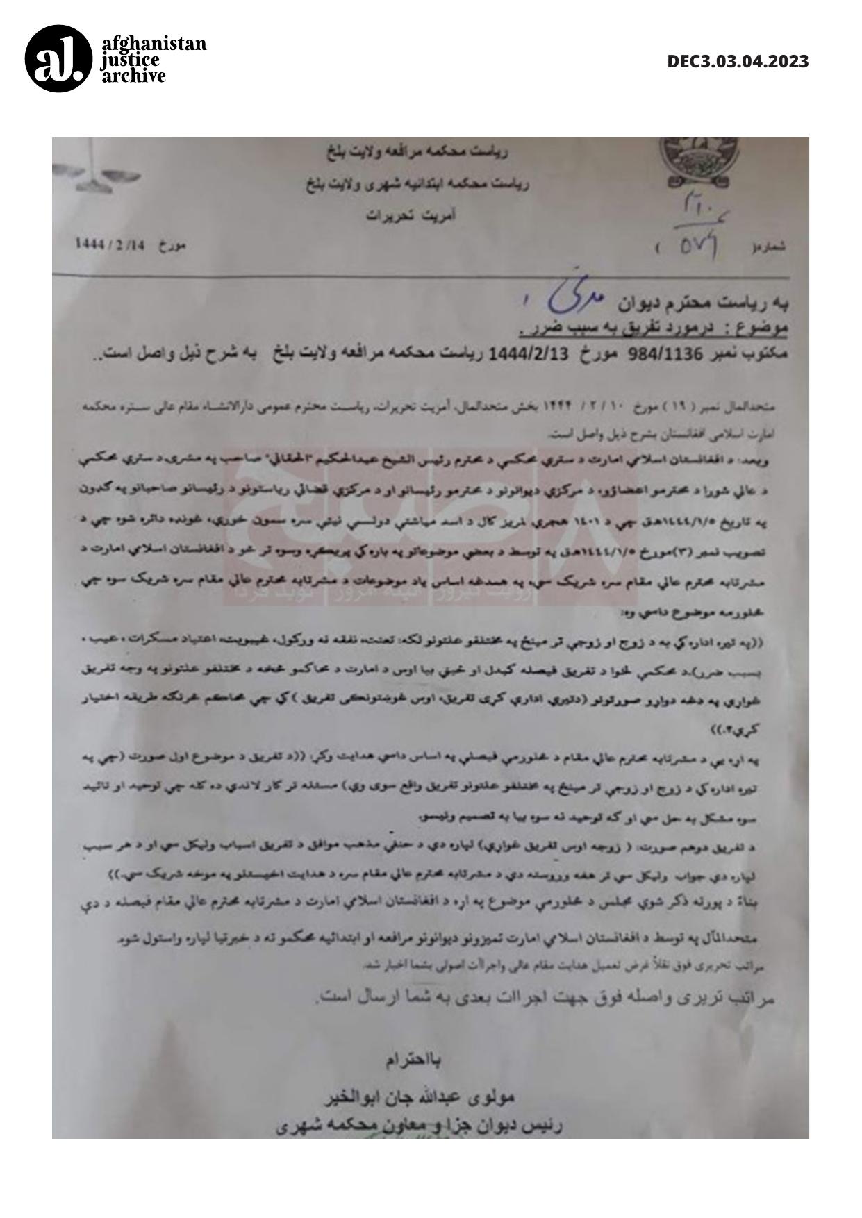 Letter No. 984/1136 dated 1444/2/13 from the BALKH Provincial Court of Appeals has been received with the following content: