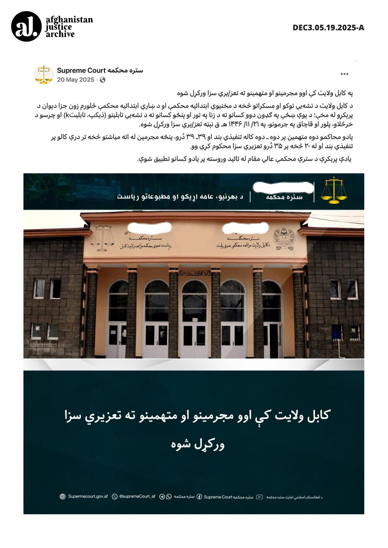 This entry documents the implementation of discretionary criminal punishments (taʿzir) in Kabul Province following rulings by Taliban primary courts. The sentences combined imprisonment with corporal punishment, including flogging, for offenses described as adultery and narcotics-related crimes. The use of lashes as part of criminal sentencing reflects the Taliban justice system’s continued reliance on corporal punishment to enforce both moral and criminal prohibitions. The approval of the sentences by the Supreme Court authority indicates centralized oversight of such punishments and their formal integration within the Taliban’s judicial framework