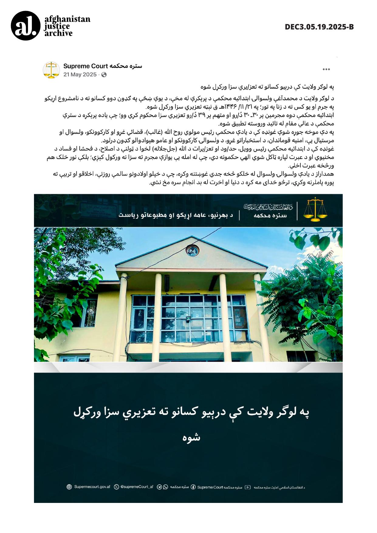 According to the ruling of the Primary Court of Mohammad Agha District in Logar Province, discretionary punishments (taʿzir) were carried out on 21/11/1446 AH against three individuals: two persons—including one woman were convicted of engaging in unlawful relations, and one individual was charged with adultery.