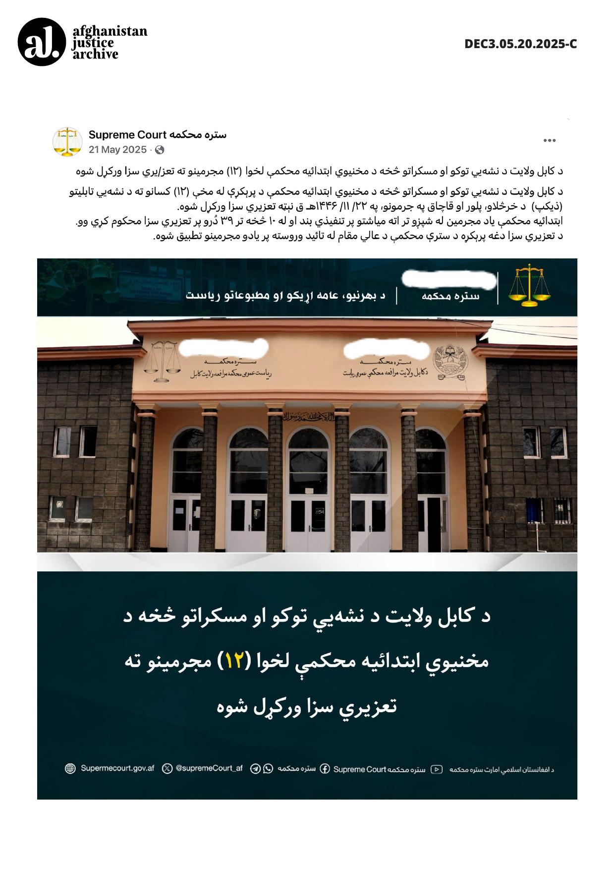 This entry documents the implementation of discretionary criminal punishments (taʿzir) in Kabul Province following rulings by the Primary Court for the Prevention of Narcotics and Intoxicants. Twelve individuals were sentenced to imprisonment and corporal punishment for offenses related to the sale and distribution of narcotic tablets. The combination of custodial sentences and flogging reflects the Taliban justice system’s reliance on corporal punishment as part of criminal enforcement. The approval of the sentences by the Supreme Court authority indicates centralized oversight in the application of these punishments.
