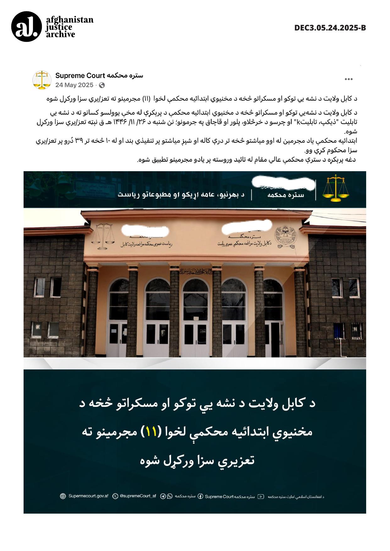 This entry documents the implementation of discretionary criminal punishments (taʿzir) in Kabul Province following rulings by the Primary Court for the Prevention of Narcotics and Intoxicants. Eleven individuals convicted of narcotics-related offenses were sentenced to imprisonment and corporal punishment. The punishments were carried out after approval by the Supreme Court authority. The case reflects the Taliban justice system’s reliance on flogging alongside custodial sentences as part of criminal enforcement for drug-related offenses.