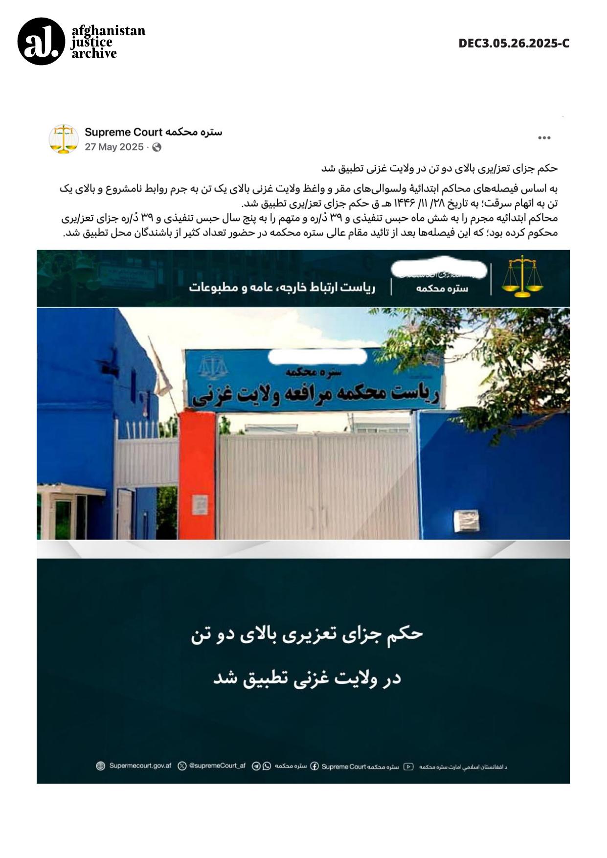 Based on the rulings of the Primary Courts of Muqur and Waghaz districts in Ghazni Province, discretionary criminal sentences (taʿzir) were carried out on 28/11/1446 AH against one individual convicted of unlawful relations and another individual accused of theft.