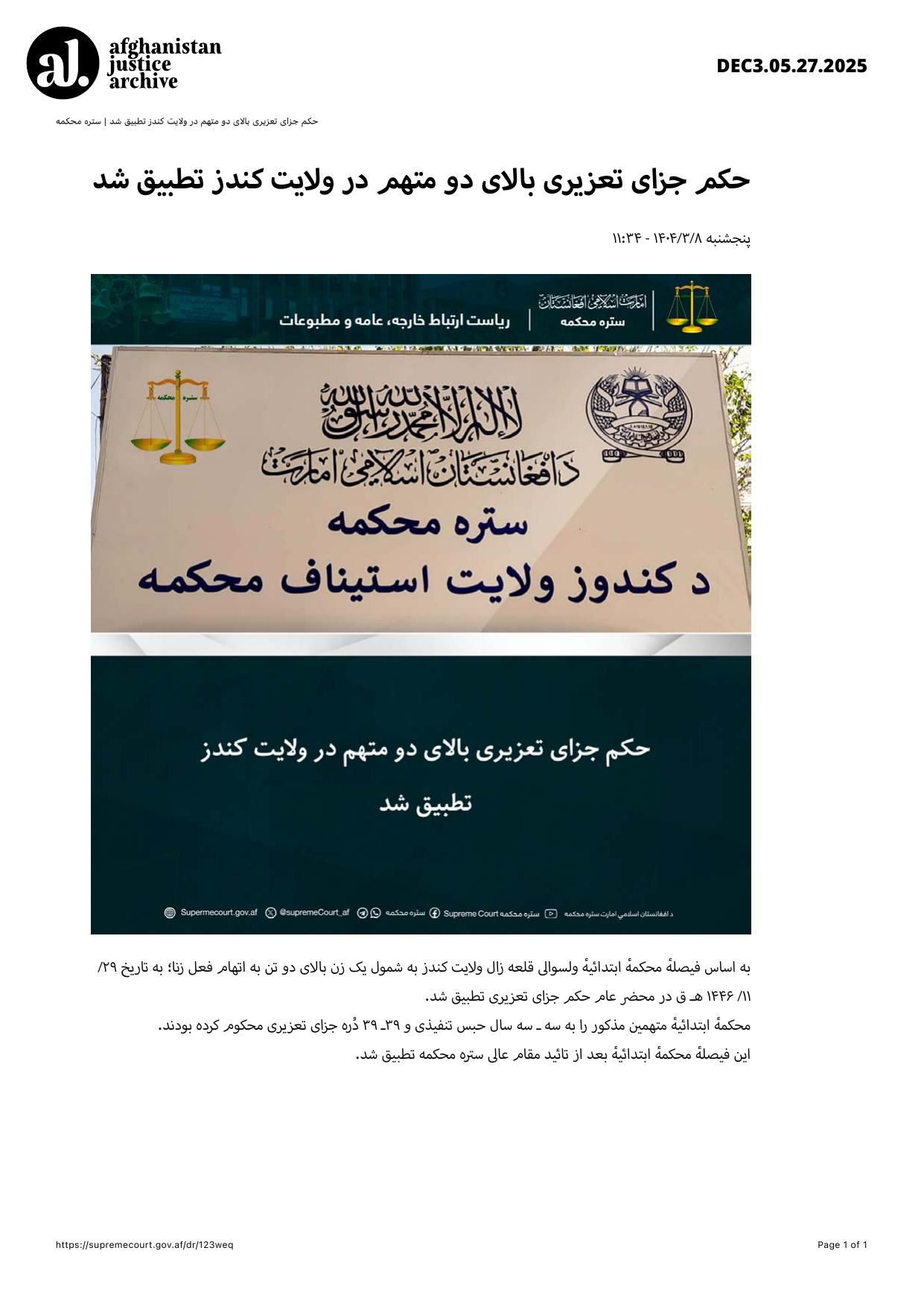 In accordance with the decision of the Primary Court of Qala-e-Zal District, Kunduz Province, disciplinary punishments were enforced on two individuals, including one woman, accused of committing adultery. The punishments were carried out publicly on 29/11/1446 AH.