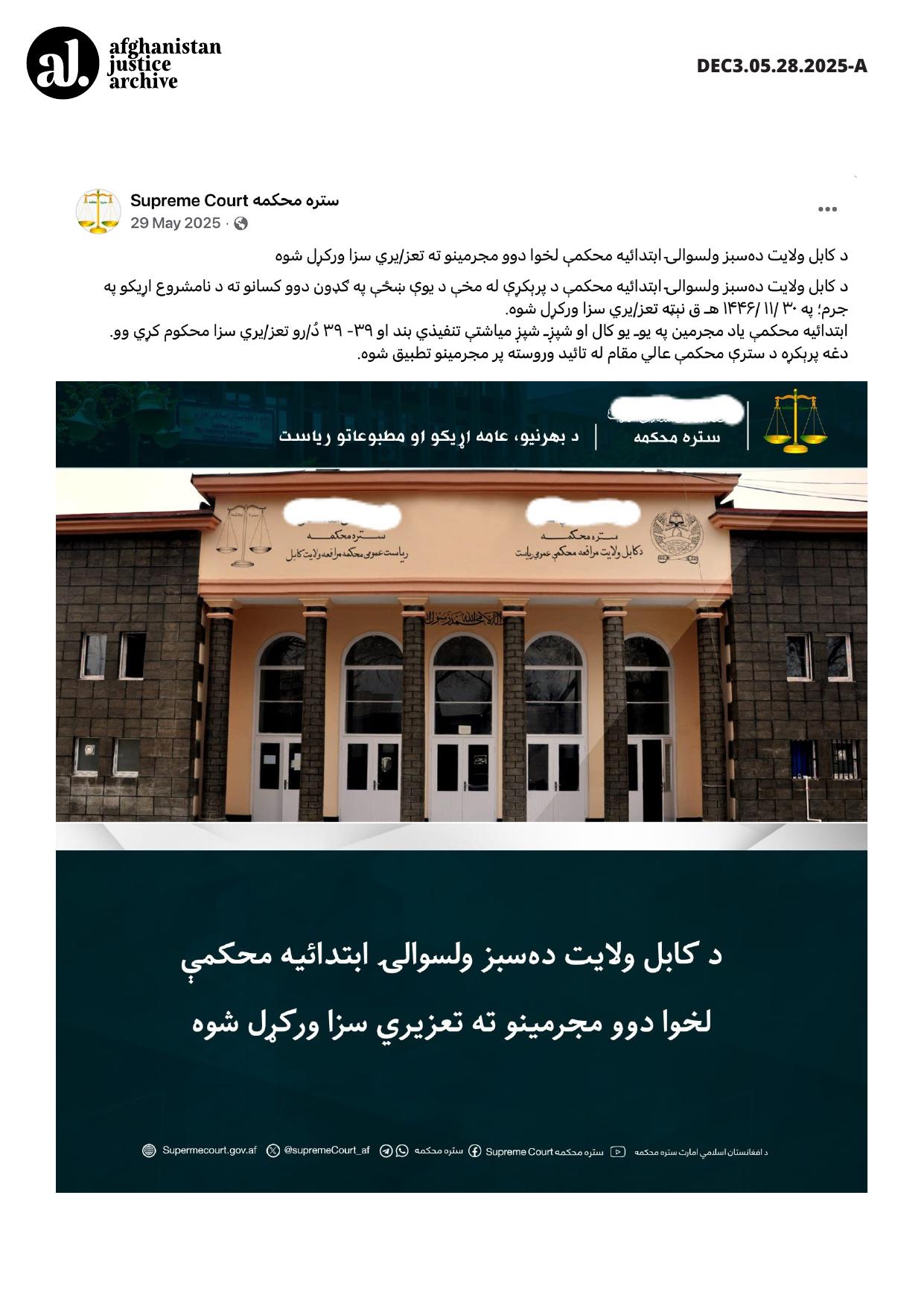 According to the ruling of the Deh‑Sabz District Primary Court of Kabul Province, discretionary punishments (taʿzir) were carried out on 30/11/1446 AH against two individuals, including one woman, convicted of engaging in unlawful relations.