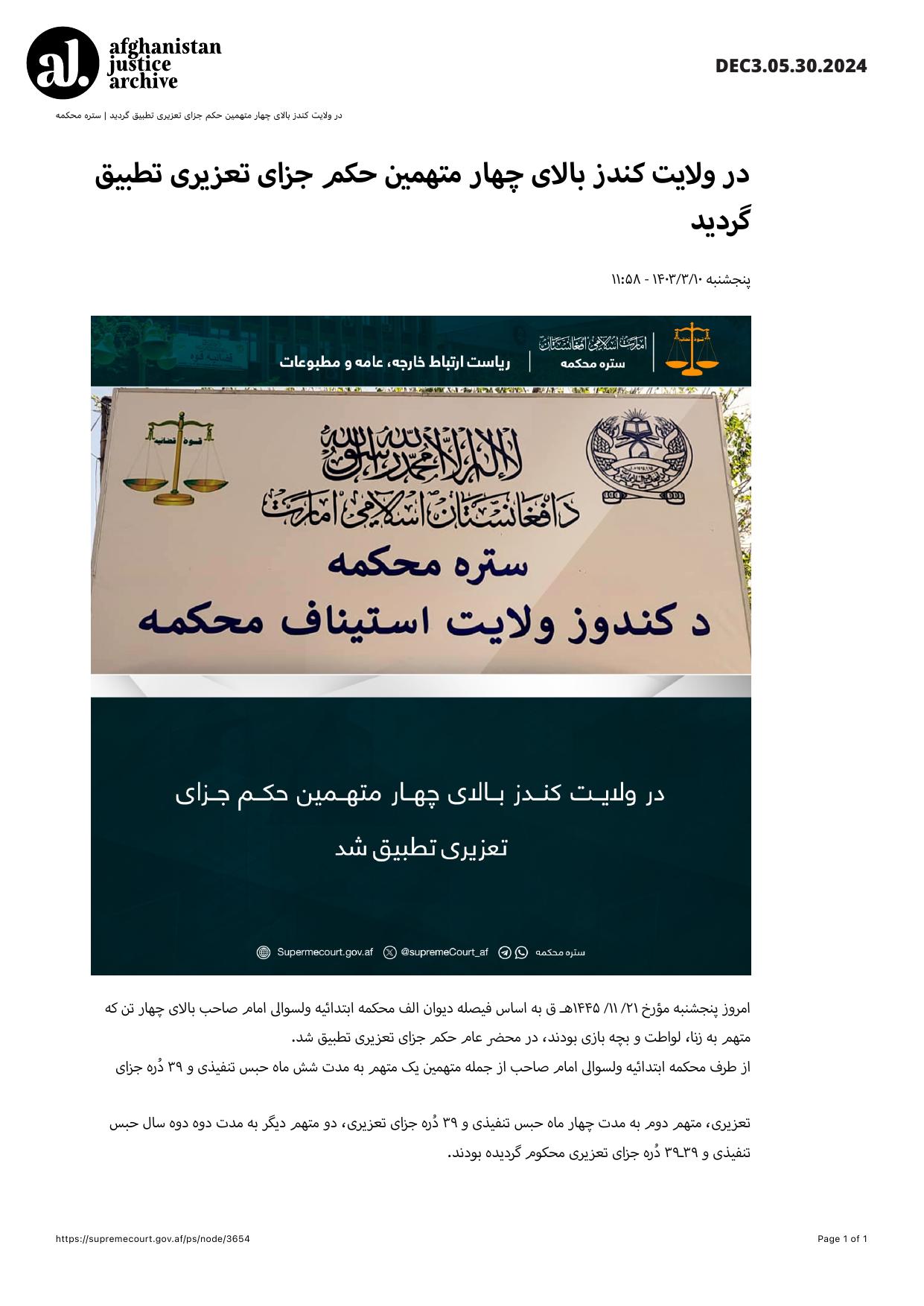 On Friday, 30 May 2024, according to the decision of the Primary District Court of Imam Sahib District in Kunduz province, four individuals accused of adultery, sodomy, and child molestation were publicly subjected to discretionary punishment.