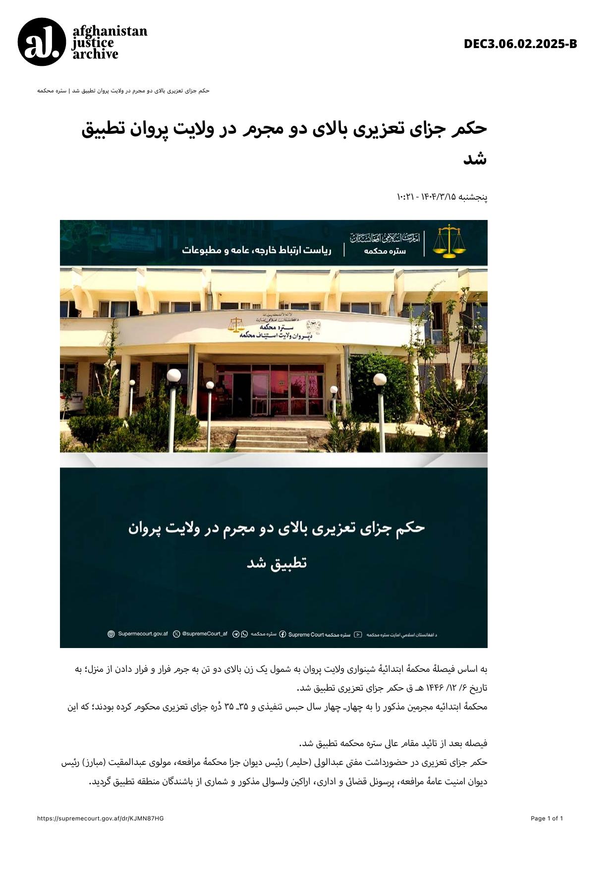 This entry documents the implementation of discretionary criminal punishment (taʿzir) in Shinwari District of Parwan Province following a ruling by a Taliban primary court. Two individuals, including a woman, convicted of fleeing from home and facilitating escape were sentenced to imprisonment and corporal punishment. The punishments were carried out after confirmation by the Supreme Court authority and were implemented in the presence of judicial officials, local authorities, and members of the public. The case reflects the use of custodial sentences and flogging within the Taliban justice system to enforce social norms related to family control and personal conduct.