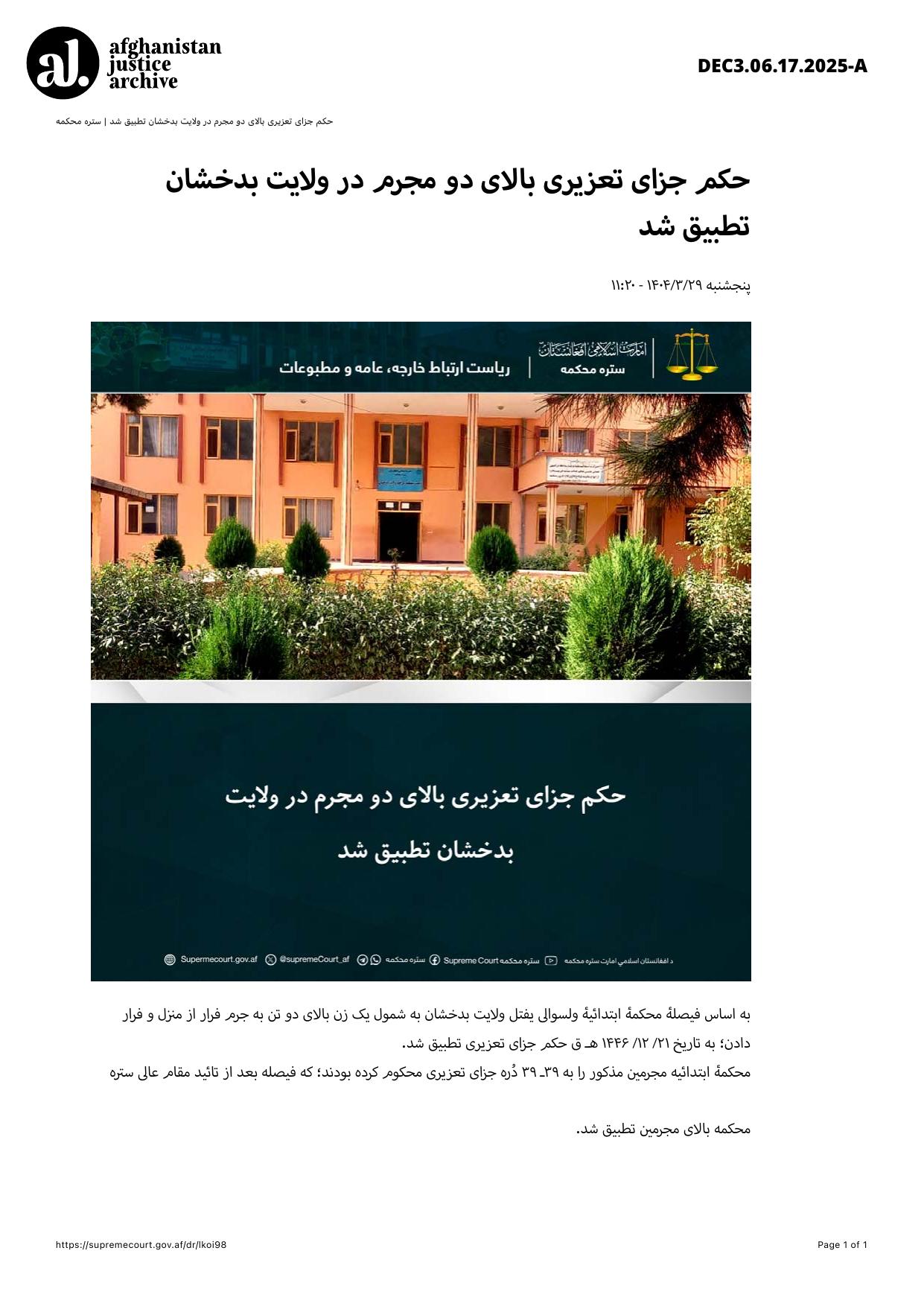 In accordance with the decision of the Primary Court of Yaftal District, Badakhshan Province, disciplinary punishments were enforced on two individuals, including one woman, convicted of fleeing from home and facilitating escape. The punishments were carried out on 21/12/1446 AH.