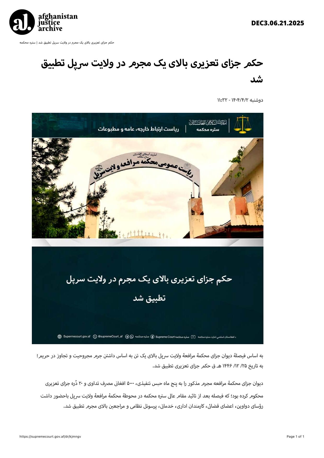 The Criminal Division of the Appellate Court had sentenced the convict to five months of imprisonment, payment of 5,000 Afghanis for medical expenses, and 20 lashes as a disciplinary penalty. This ruling was executed after confirmation by the esteemed Supreme Court in the courtyard of the Appellate Court of Sar-e-Pul Province, in the presence of division heads, judicial members, administrative and service staff, military personnel, and visitors.