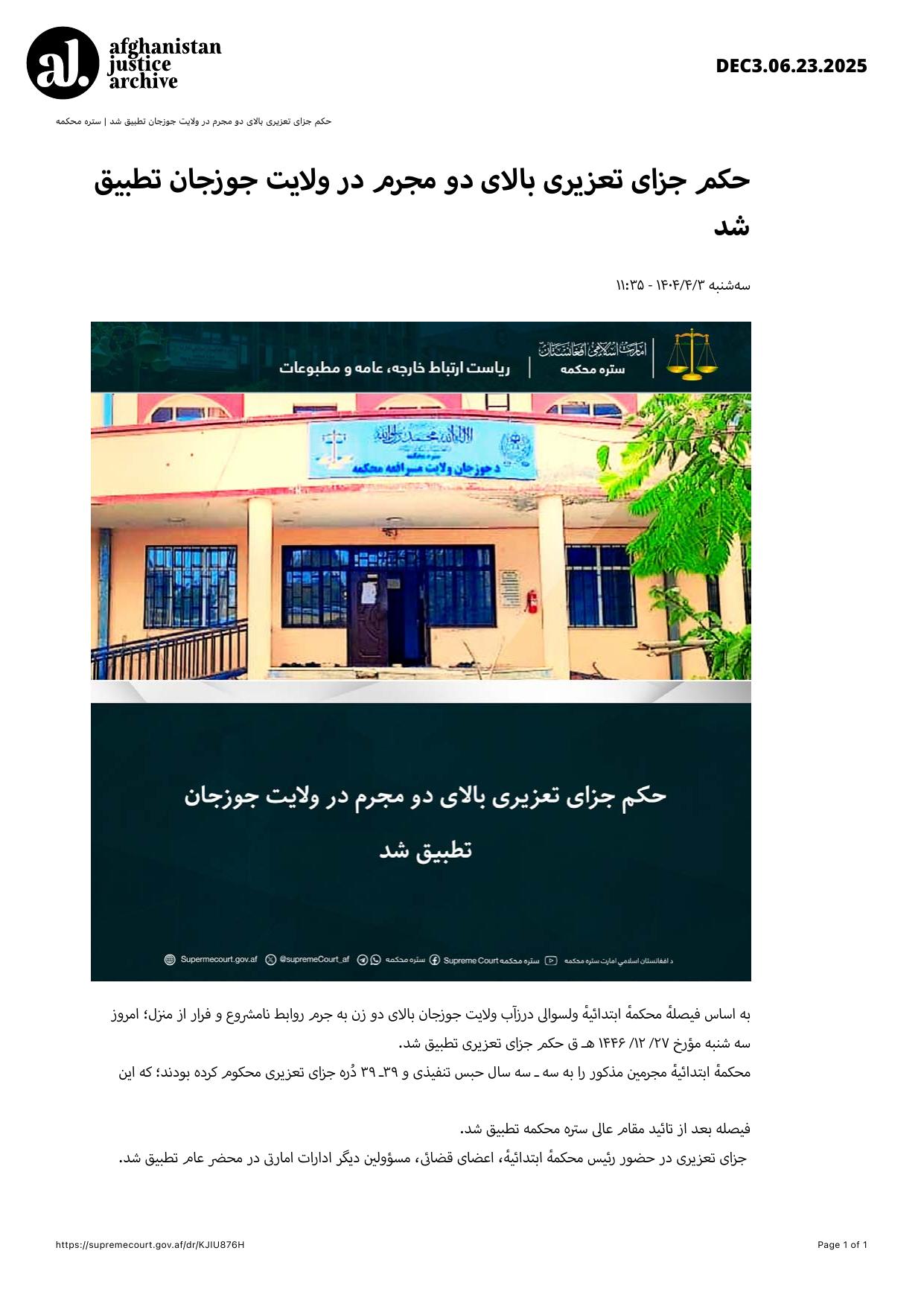 In accordance with the decision of the Primary Court of Darzab District, Jawzjan Province, disciplinary punishments were enforced on two women convicted of engaging in illicit relations and fleeing from home. The punishments were carried out today, Tuesday, 27/12/1446 AH.