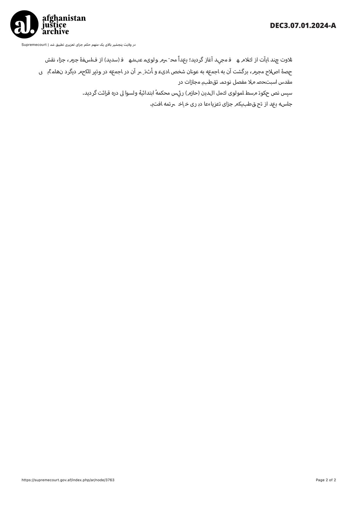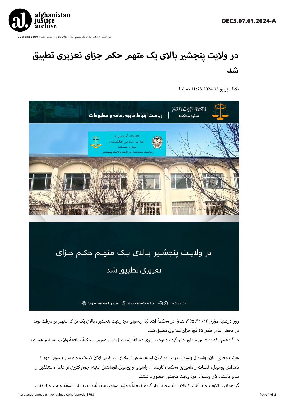 Date: 24/12/1445 On Monday, July 1 2024,, according to the decision of the Urban Court of Panjshir province, two individuals accused of adultery were publicly subjected to a discretionary punishment of 39 lashes each.