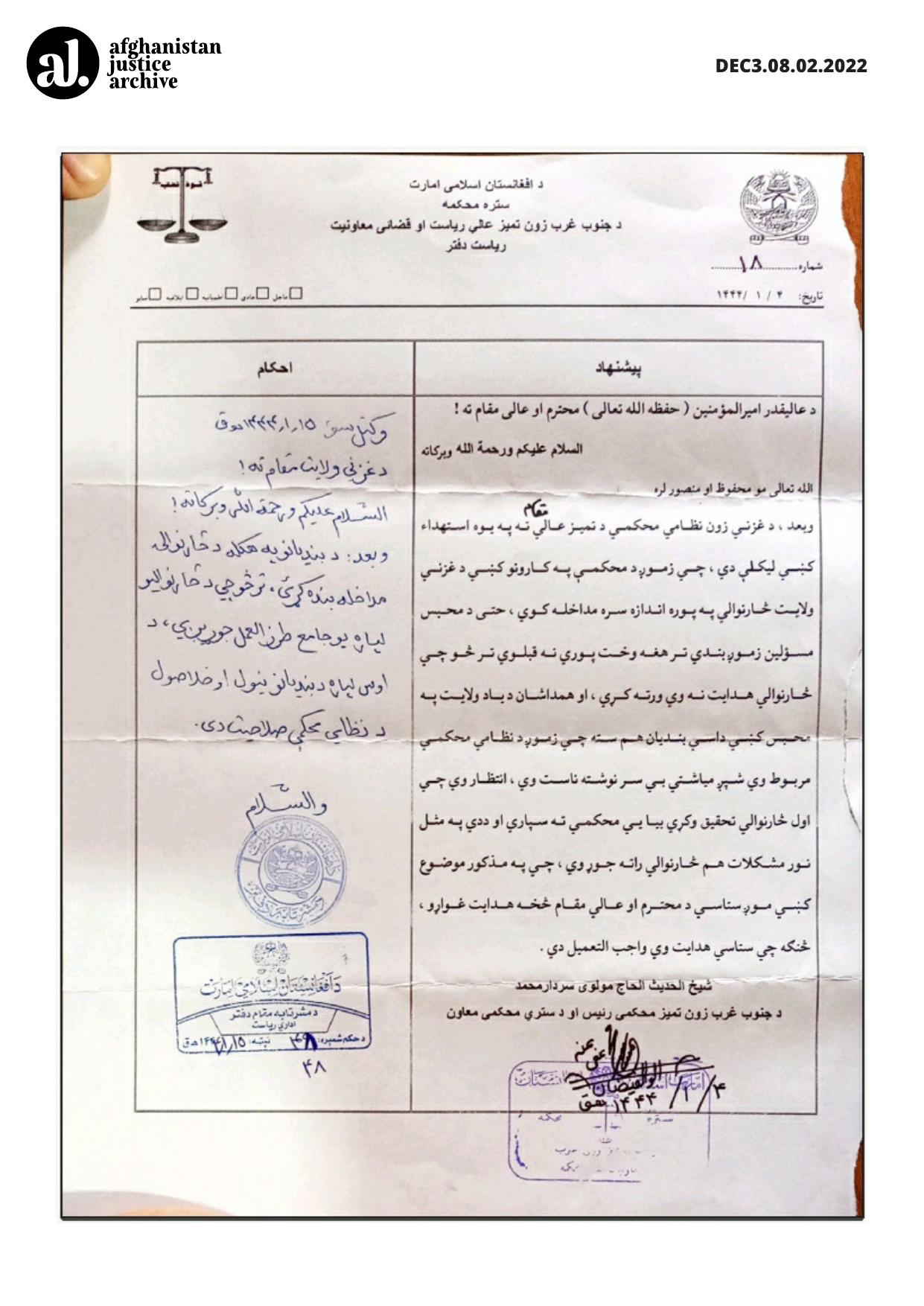 More recently, both written and verbal orders from Akhundzada have formally renamed the Attorney General’s Office as the Loy Directorate of Supervision and Pursuance of Decrees and Orders. This change goes beyond semantics: it redefines the institution’s role from an independent prosecutorial body to an enforcement arm tasked solely with implementing Taliban edicts.