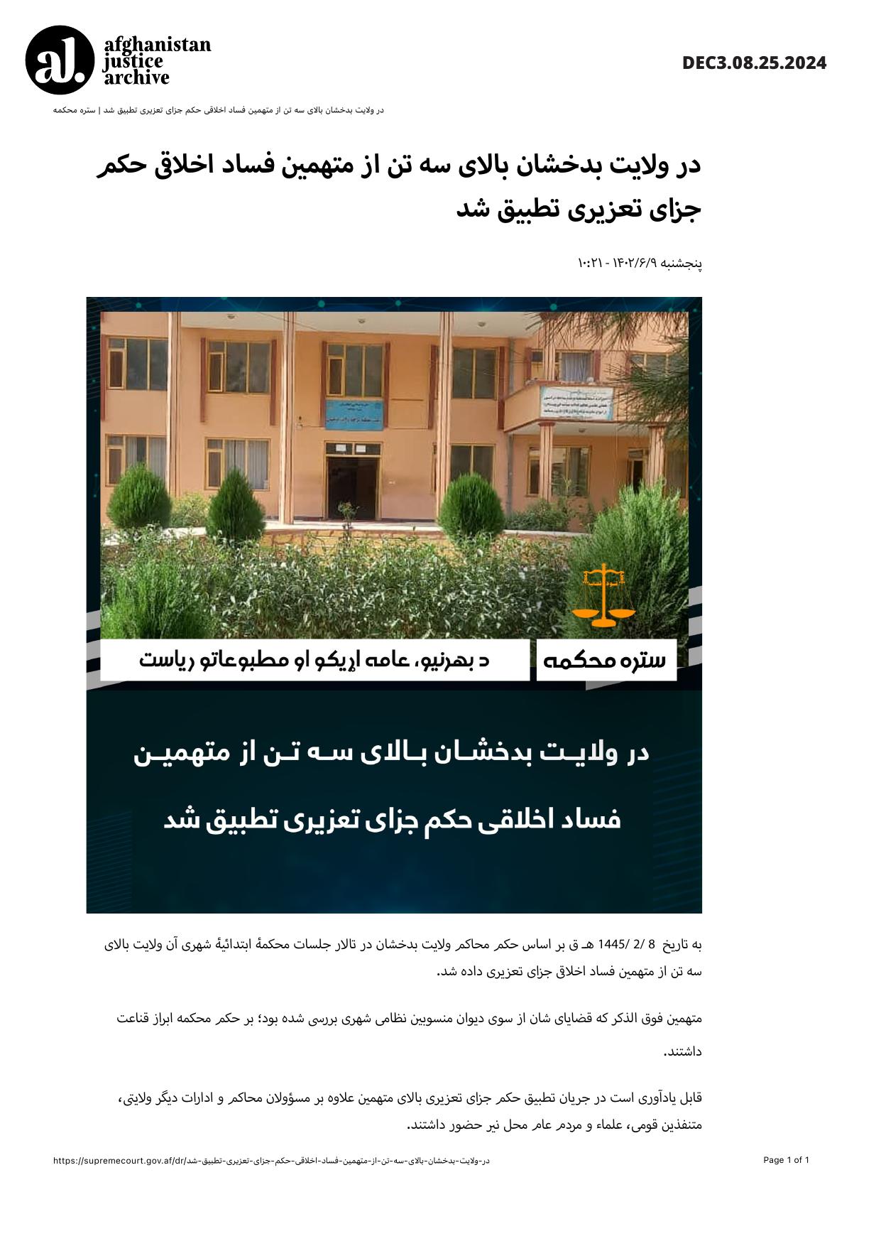 On the 8th of 2nd, 1445 AH, based on the verdict of the courts of Badakhshan province, a discretionary punishment was applied to three individuals for moral corruption in the session hall of the Primary Court of the provincial city. These individuals had been convicted by the military court, and the verdict was carried out in the presence of officials and the public