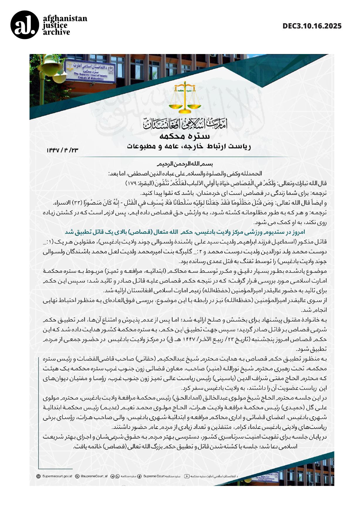 On 23 Rabiʿ al‑Akhir 1447, the divine ruling of qiṣāṣ (legal retribution) was implemented on a convicted murderer in the main sports stadium of Badghis Province.