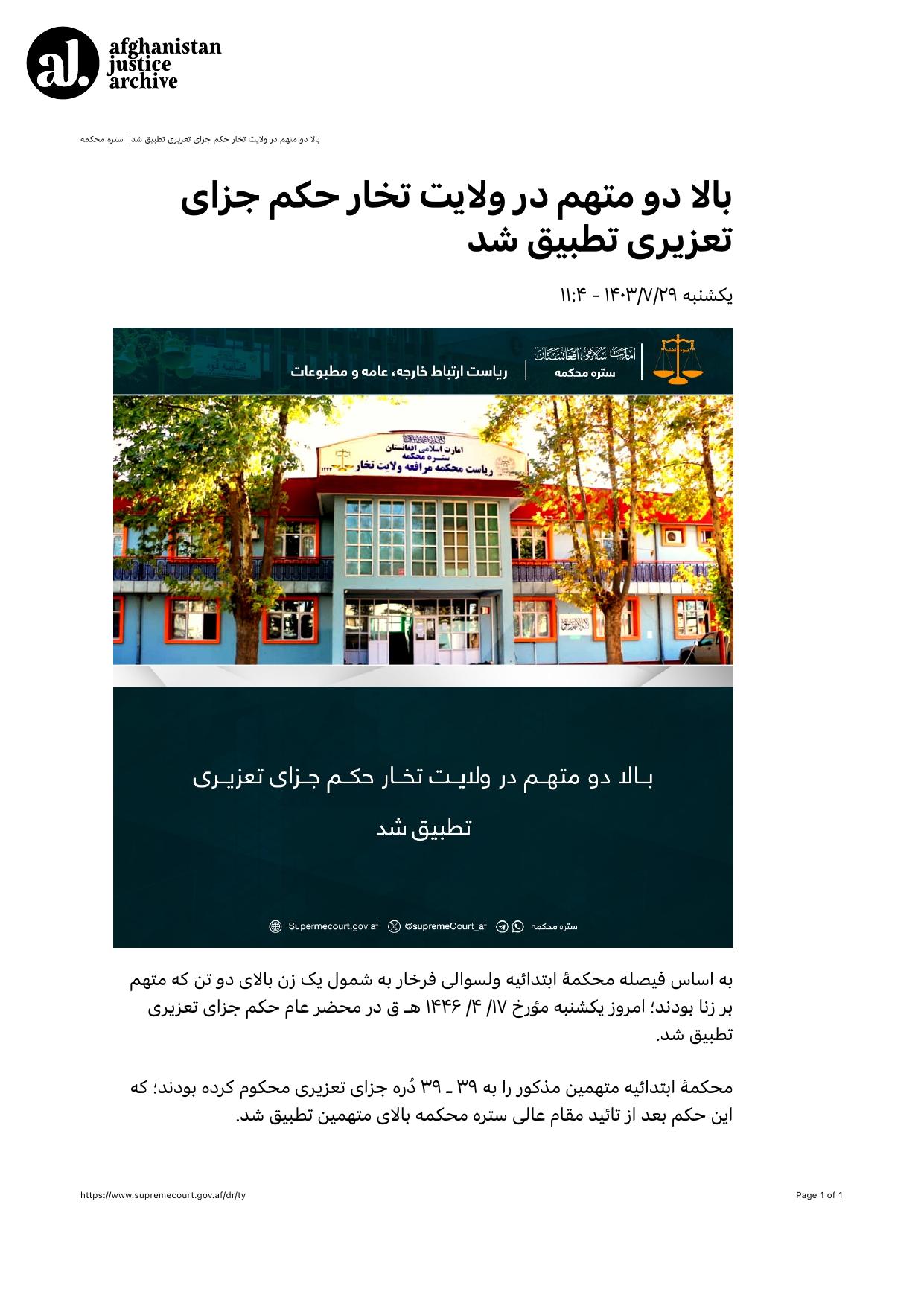 Based on the ruling of the Primary Court of Farkhar District, discretionary criminal sentences were executed today, Sunday, 17/04/1446 Hijri Qamari, in public against two individuals including one woman who were convicted of adultery. The Primary Court had sentenced both defendants to 39 lashes each as discretionary punishment. This ruling was implemented following its approval by the Supreme Court.