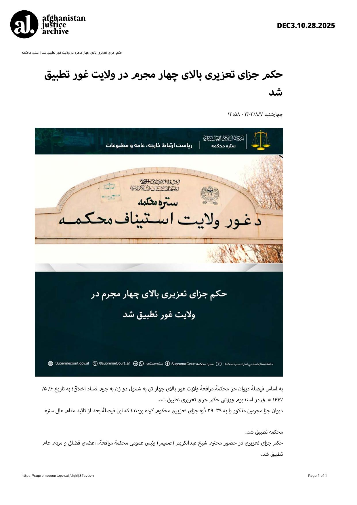 Based on the ruling of the Criminal Chamber of the Court of Appeals of Ghor Province, punitive disciplinary sentences were carried out on four individuals, including two women, for the offense of moral corruption. The implementation took place on 6/05/1447 AH at the sports stadium.