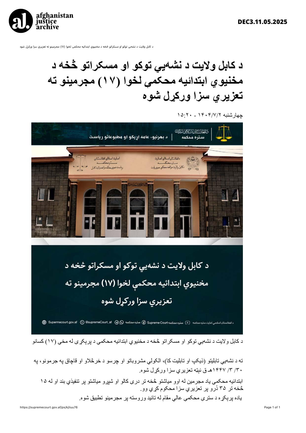 According to the decision of the Kabul Province Primary Court for the Prevention of Narcotics and Intoxicants, seventeen (17) convicted individuals were subjected to discretionary punishment on 14/5/1447 AH for crimes related to the sale and trafficking of narcotic tablets (Zikap and Tablet K), alcoholic beverages, and cannabis.