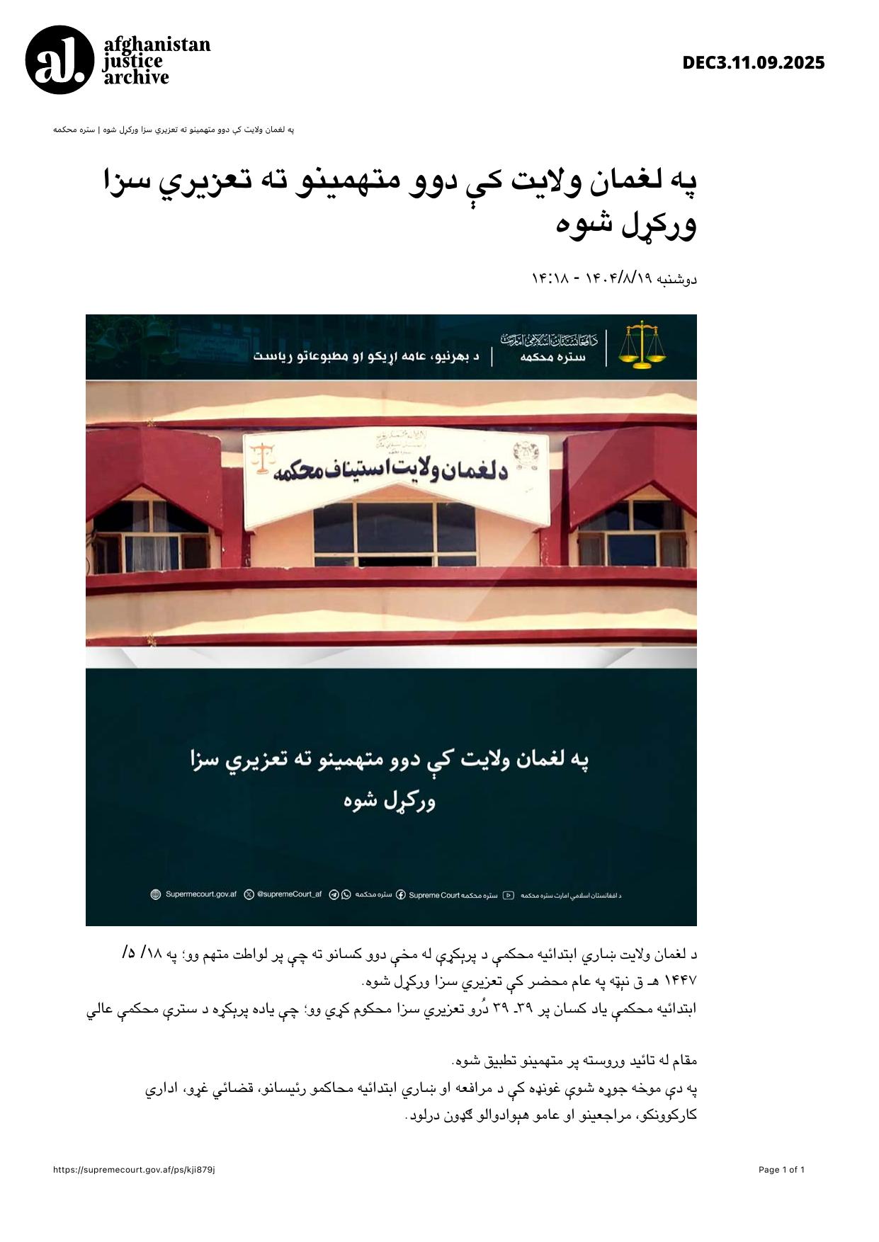 According to a ruling issued by the Urban Primary Court of Laghman Province, two individuals accused of liwat (same‑sex conduct) were subjected to discretionary punishment (ta‘zīr) on 18/5/1447 AH in a public gathering.