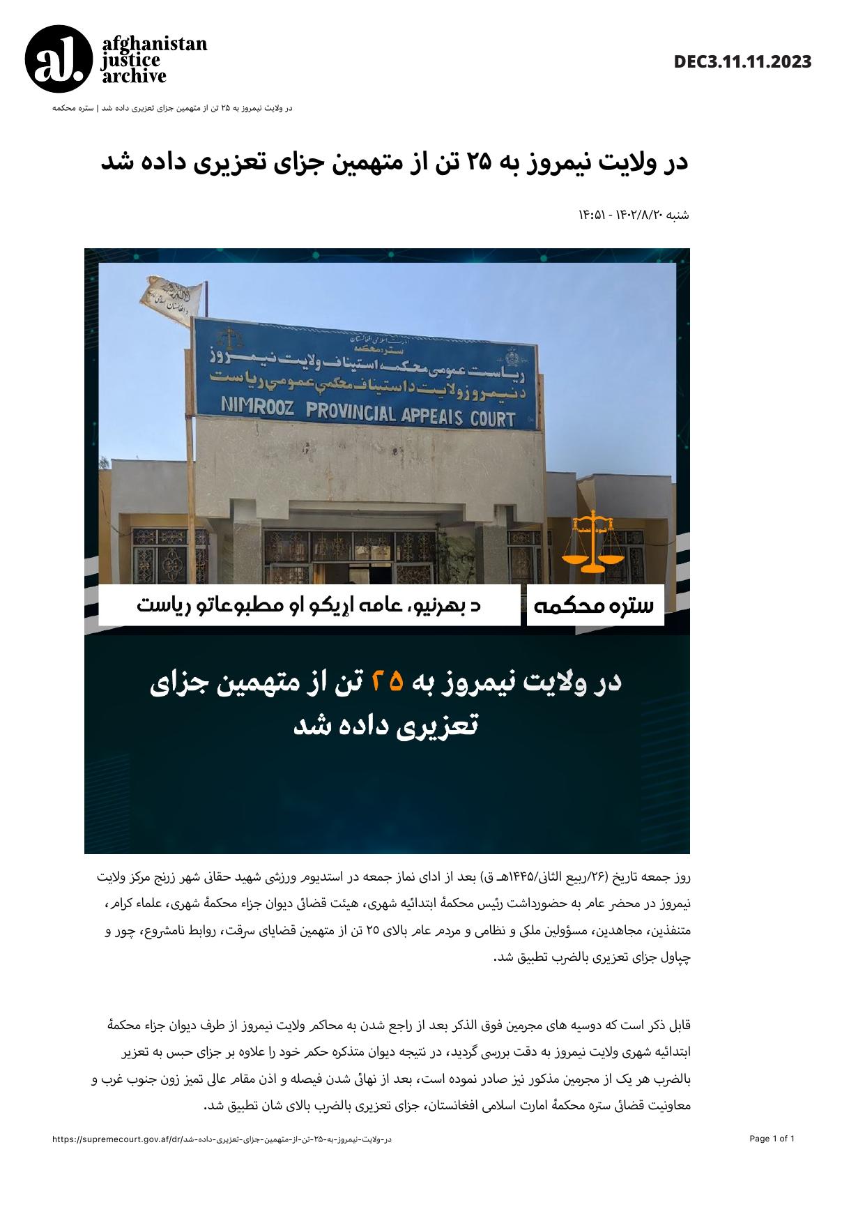 Date: 26/04/1445 On Friday, the date (26th Rabi' al-Thani, 1445 AH), following the congregation for Friday prayers at Shahid Haqani Sports Stadium in Zaranj city, the capital of Nimroz Province, a public gathering was held attended by the Chief Judge of the City Court, the judicial delegation of the Criminal Court, esteemed scholars, enforcers, mujahideen, governmental and military officials, and the general public. Punitive measures were applied, by way of physical punishment, to more than 25 individuals accused of crimes including theft, unlawful relationships, burglary, and looting.