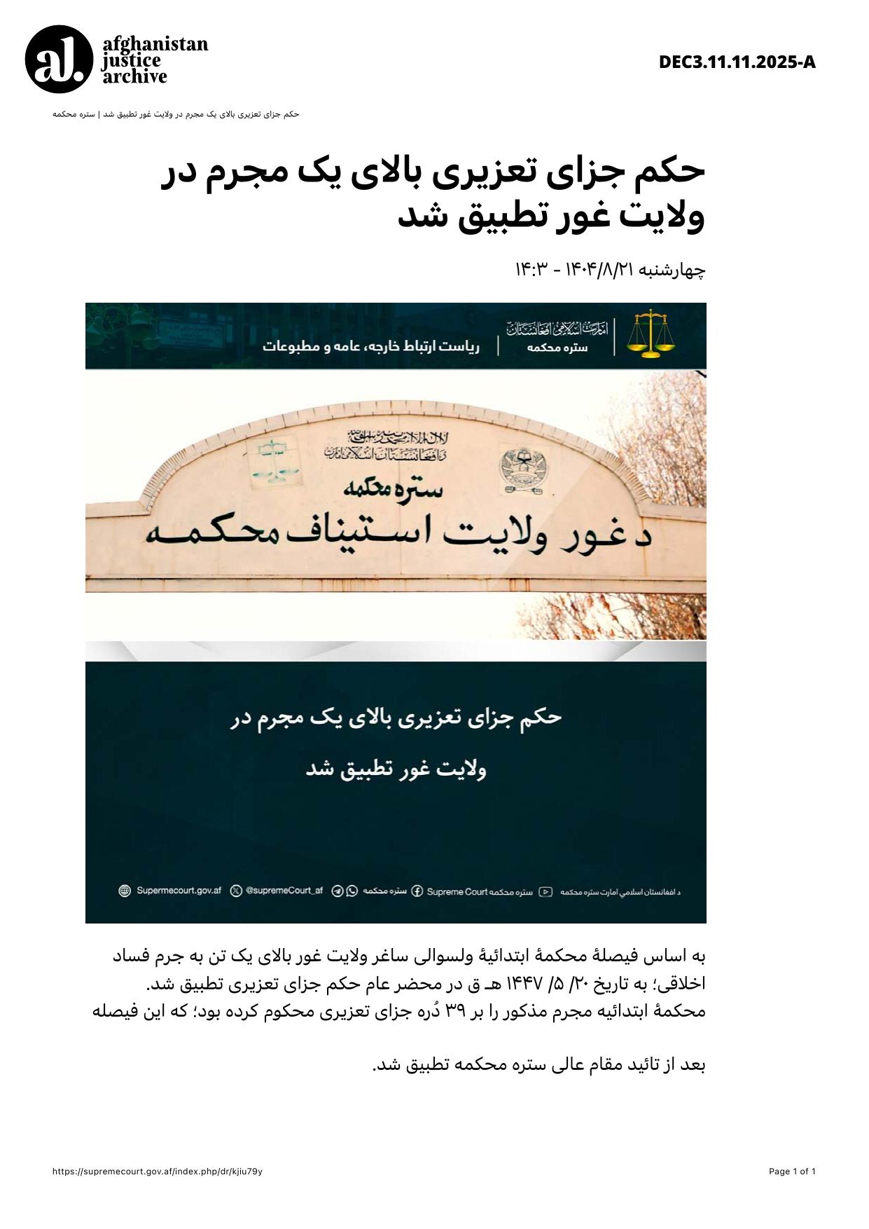 Based on the decision of the Primary Court of Saghar District in Ghor Province, a discretionary criminal punishment (ta‘zīr) was carried out publicly on 20/5/1447 AH against an individual convicted of moral corruption.