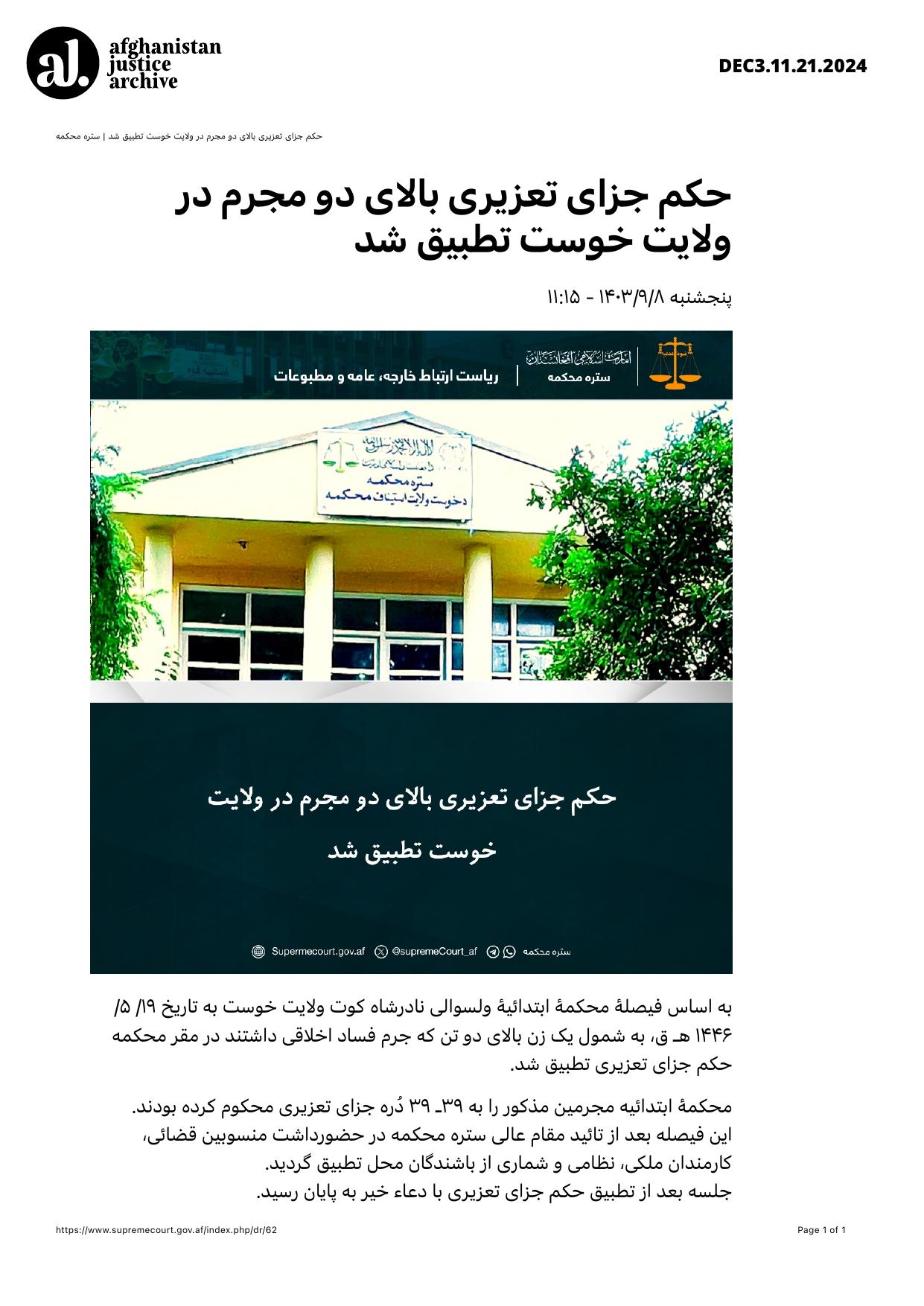 In accordance with the ruling of the Primary Court of Nadershah Kot District, Khost Province, dated 19/5/1446 Hijri, discretionary criminal punishment was carried out at the court premises against two individuals, including one woman, convicted of moral corruption.