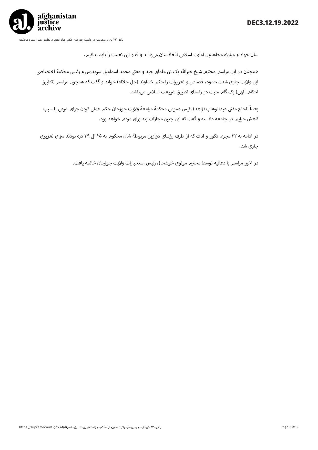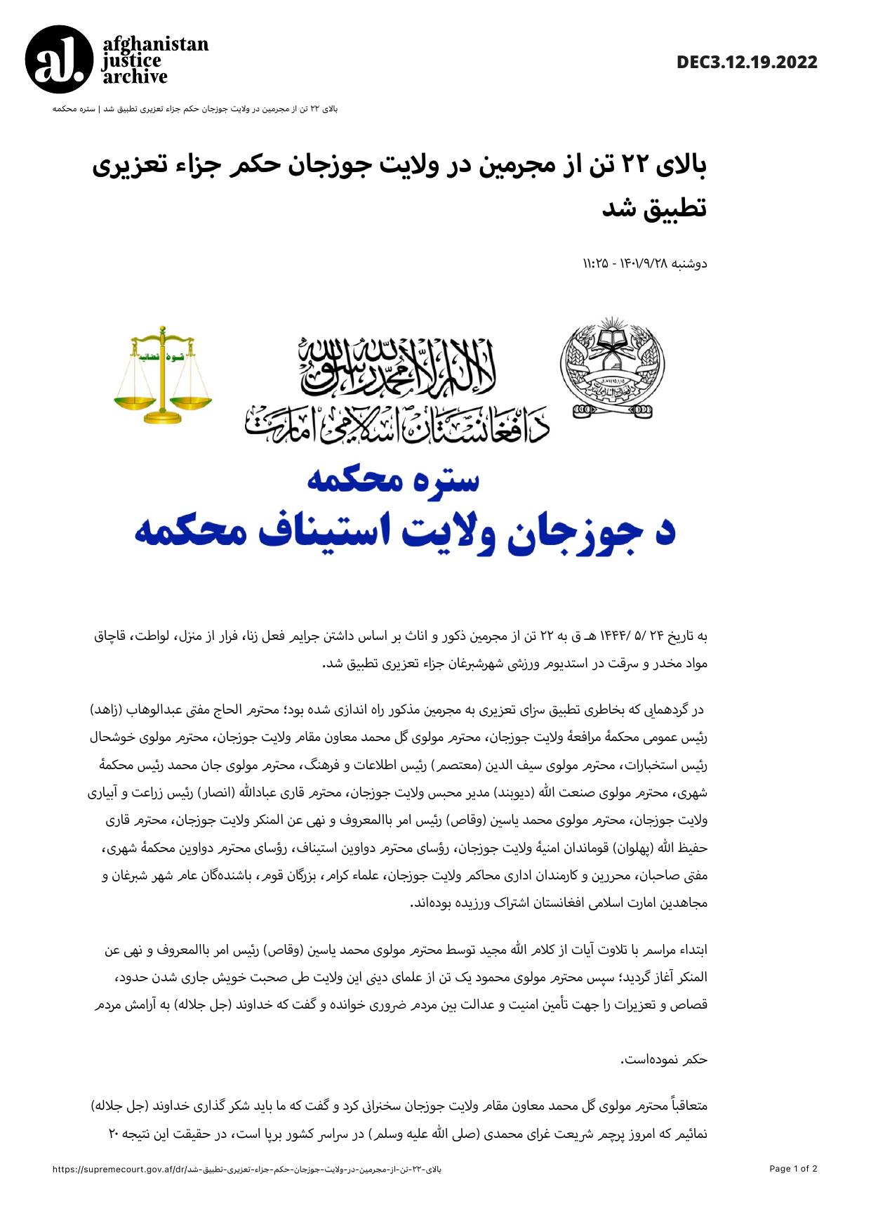 Date: 24/05/1444 The Taliban Supreme Court has announced in a press release on its official website that, based on the ruling of the Jawzjan Provincial Court of Appeal and the approval of the Taliban Supreme Court, more than 22 men and women were flogged at the Sheberghan City Sports Stadium on charges of adultery, running away from home, sodomy, smuggling, and theft. This order was carried out in public with the participation of Taliban leadership officials in the province, and each of these individuals received 25 to 35 lashes.
