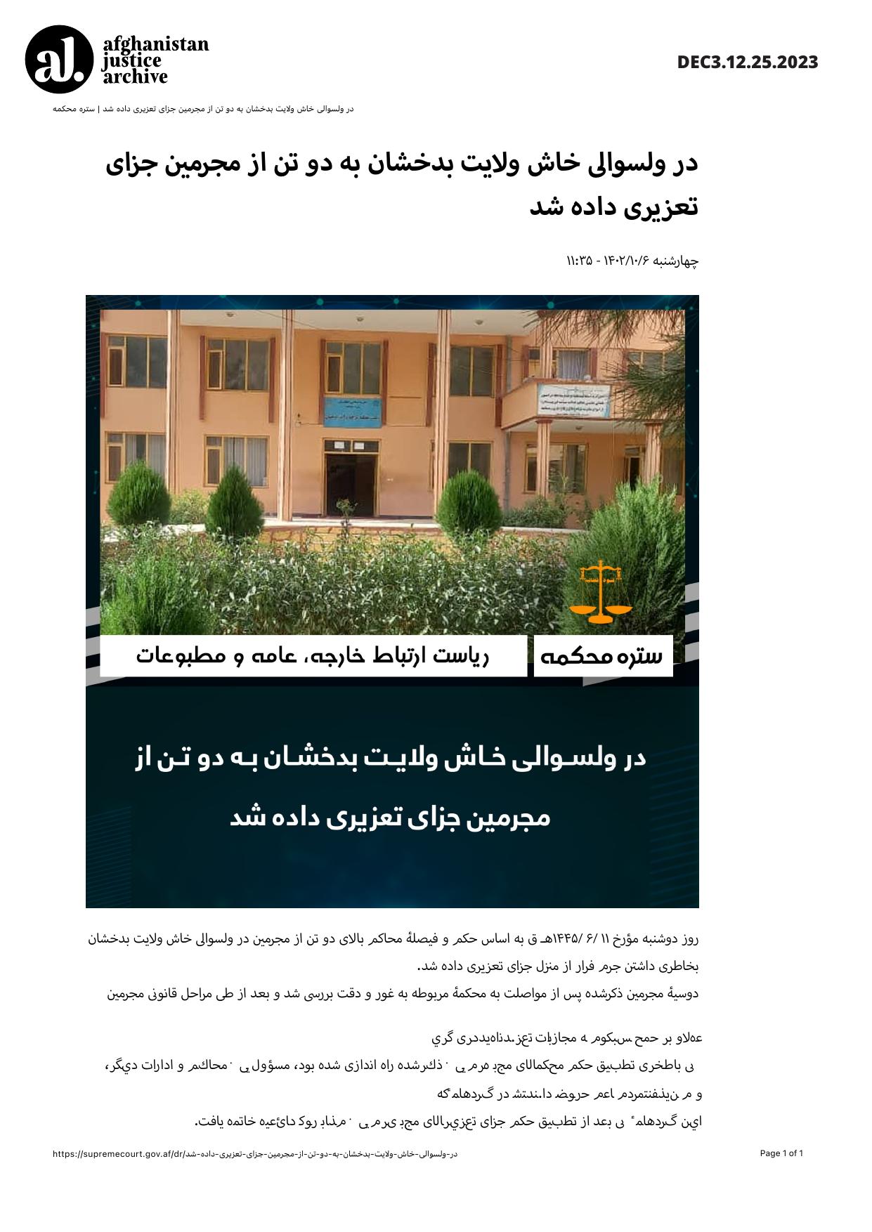 On Monday, dated 11/6/1445 AH, based on the verdicts and decisions of the courts, punitive measures were imposed on two criminals in Khawsh District, Badakhshan Province, due to the crime of fleeing from home. The cases of the aforementioned criminals were carefully examined by the relevant court, and after completing the legal procedures, the criminals were sentenced not only to imprisonment but also to punitive measures.