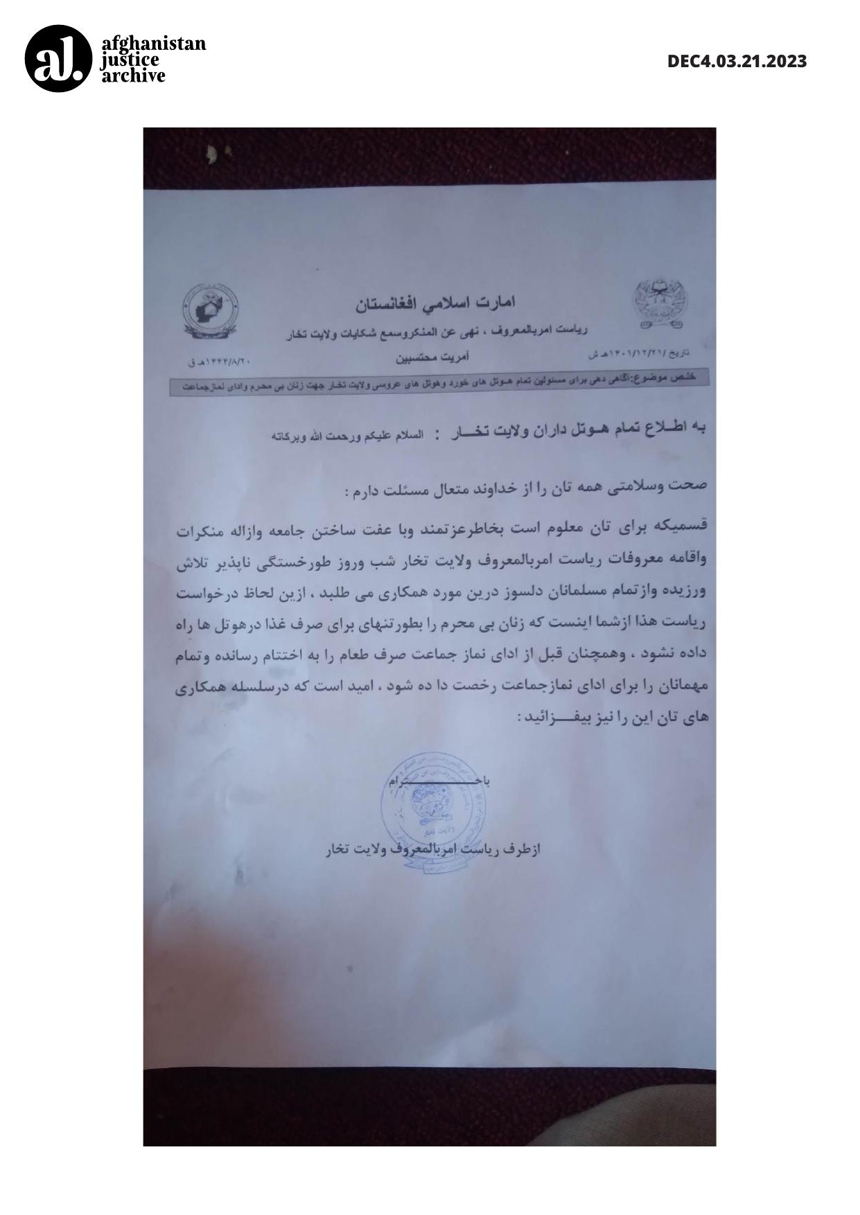 Subject: Awareness for Hotel and Wedding Hall Owners in Takhar Province Regarding Women Without a Guardian and Congregational Prayer