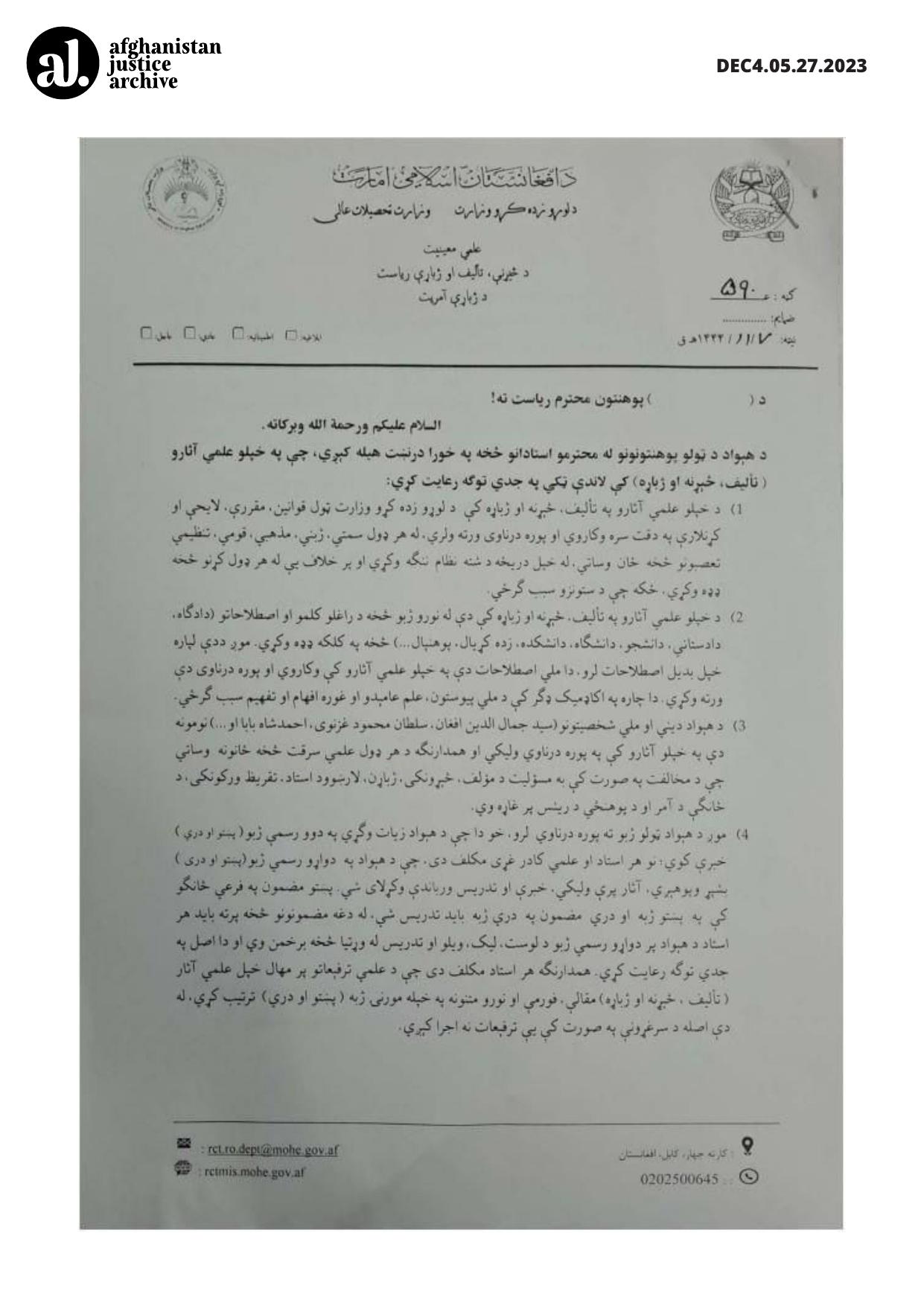 It is also mandated that faculty members prepare their academic works (writing, research, and translation) in Pashto and Dari when applying for academic promotions, including articles, forms, and other written materials. Failure to comply with this directive will result in the denial of promotion.