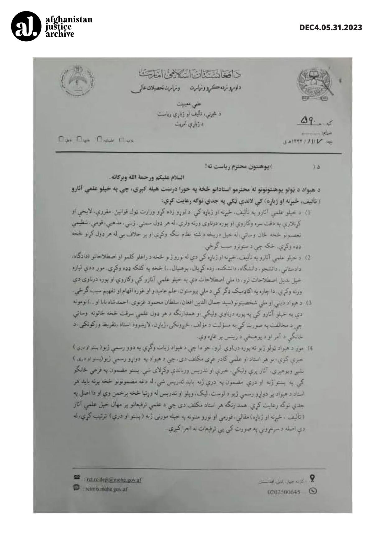 Furthermore, every professor is responsible for arranging their academic promotions and ensuring that their academic works (research, writing, and publications) are formatted and presented in their chosen official language (Pashto and Dari). Promotions will not be processed without adherence to these principles.