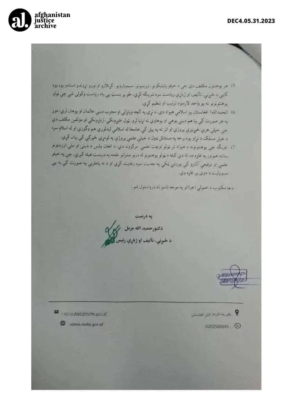 4) Given our country's multilingual context, ensure that you communicate and teach in both official languages (Pashto and Dari). Every professor and academic staff member is obliged to write, publish, lecture, and teach in both official languages (Pashto and Dari) as required. Pashto subjects should be taught in Pashto, and Dari subjects in Dari. This principle must be strictly adhered to in all academic writings, lectures, and instructions.
