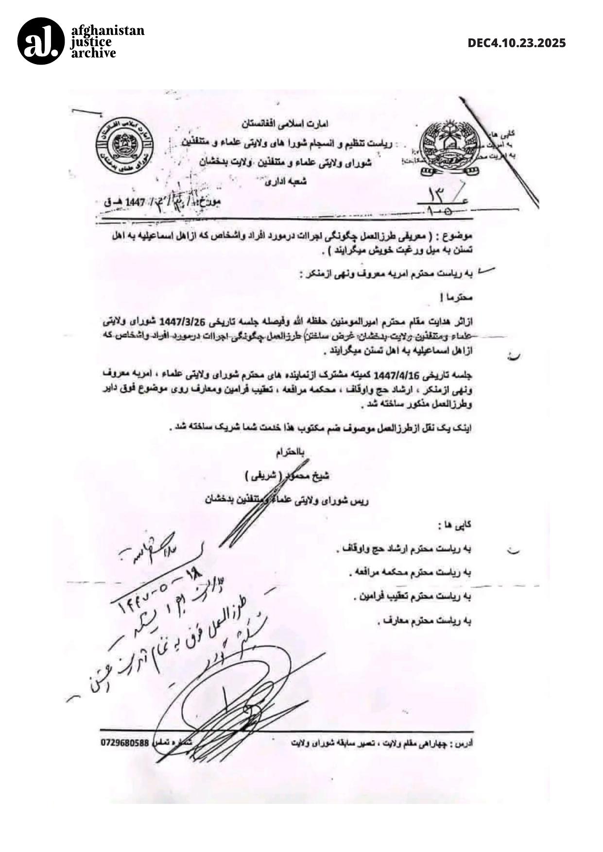 Pursuant to the guidance of the respected leader of Amir al Muminin (may Allah protect him), and in accordance with the decision of the historic session held on 26 / 3 / 1447 AH by the Provincial Council of Scholars and Community Elders of Badakhshan Province, a procedure was to be prepared to clarify how actions should be carried out regarding individuals and persons who convert from the Ismaili sect to Sunni Islam.