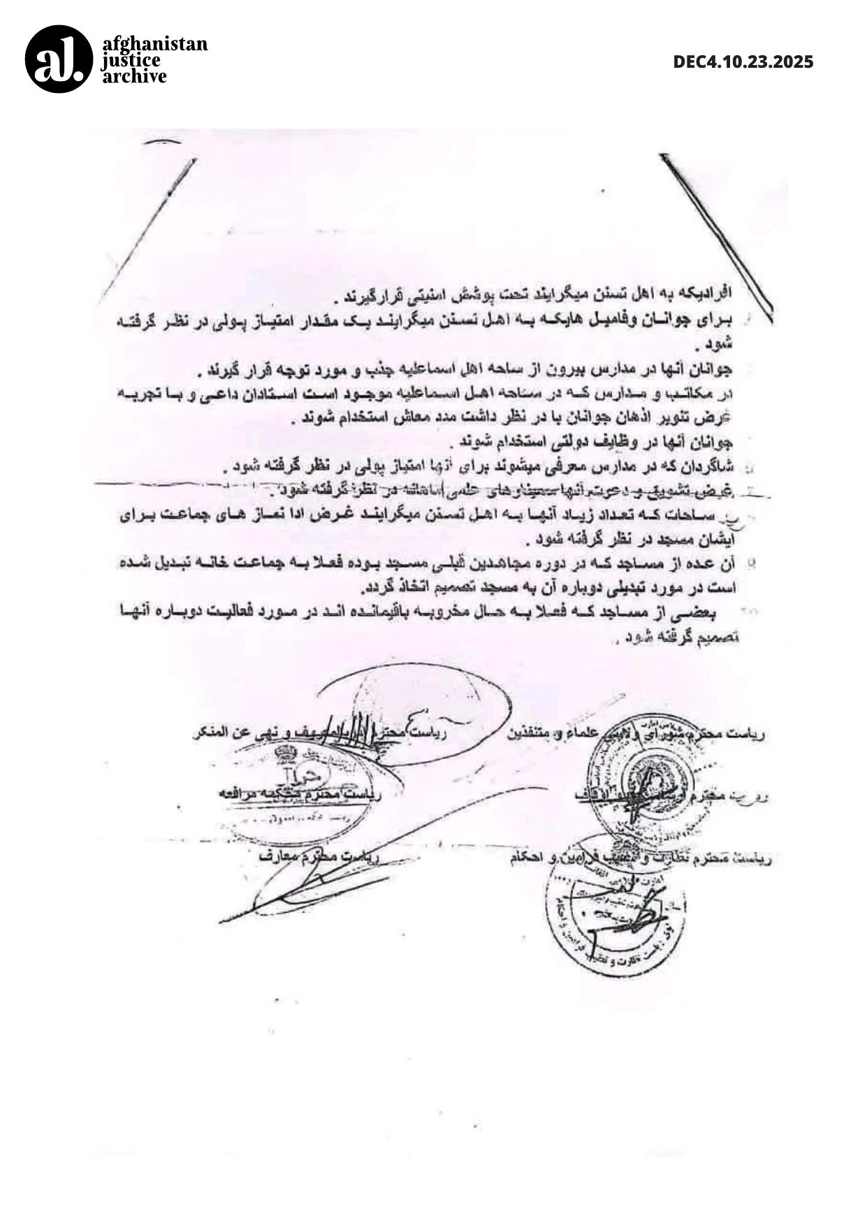 This entry documents the establishment of a formal procedure in Badakhshan Province governing the treatment of individuals converting from the Ismaili sect to Sunni Islam. The involvement of religious, judicial, and administrative bodies reflects the institutional coordination of religious oversight, indicating the regulation of belief and conversion through state-aligned mechanisms within the Taliban’s governance system.