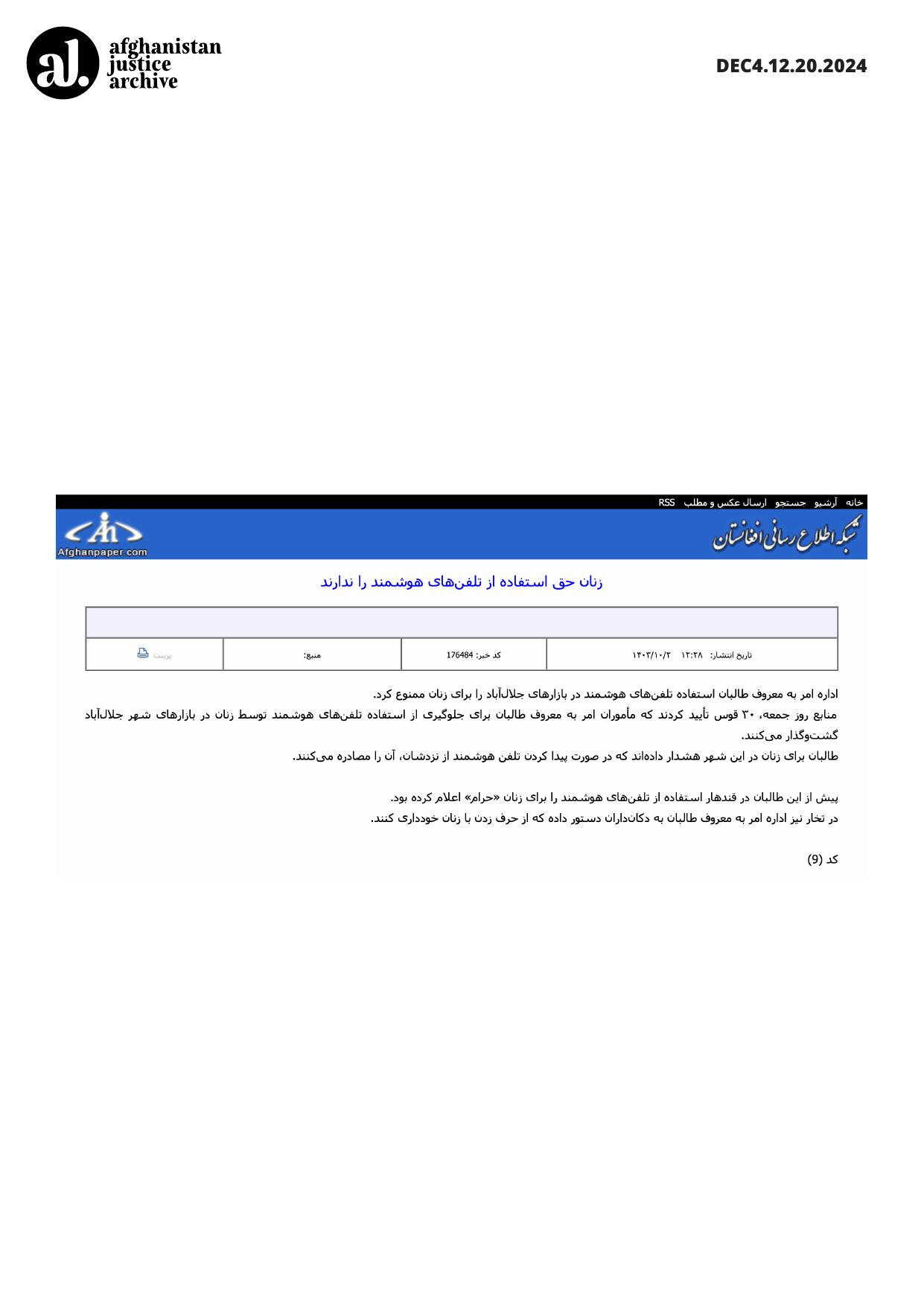 The ban enforced by the Department for the Promotion of Virtue and Prevention of Vice on women’s use of smartphones in Jalalabad, including market patrols and threats of confiscation, represents the coercive enforcement of digital exclusion through moral policing. Coupled with similar declarations in Kandahar Province and orders in Takhar Province restricting interaction with women, the measures indicate a coordinated expansion of gender-based isolation across physical and digital spaces. These actions systematically sever women’s access to information, communication, and economic participation while normalizing surveillance and confiscation as enforcement tools.