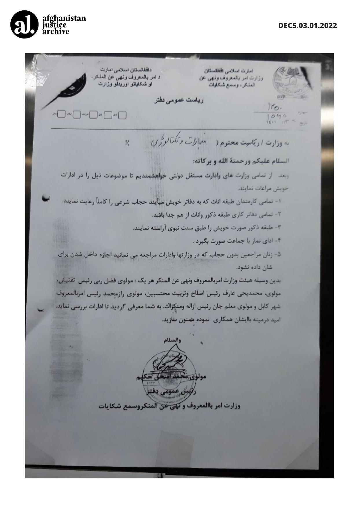 Based on a document received by Afghanistan International, the Taliban's Ministry promotion of virtue and prevention of vice has instructed ministries not to allow women without "Islamic hijab" to enter government offices. Additionally, they have ordered that the offices be segregated for male and female employees, and men should adhere to the "Prophetic tradition" in their attire. This department, responsible for enforcing the Taliban's interpretation of Sharia law in Afghanistan, has advised men to dress according to what this group considers the Prophetic tradition (the way of the Prophet of Islam).